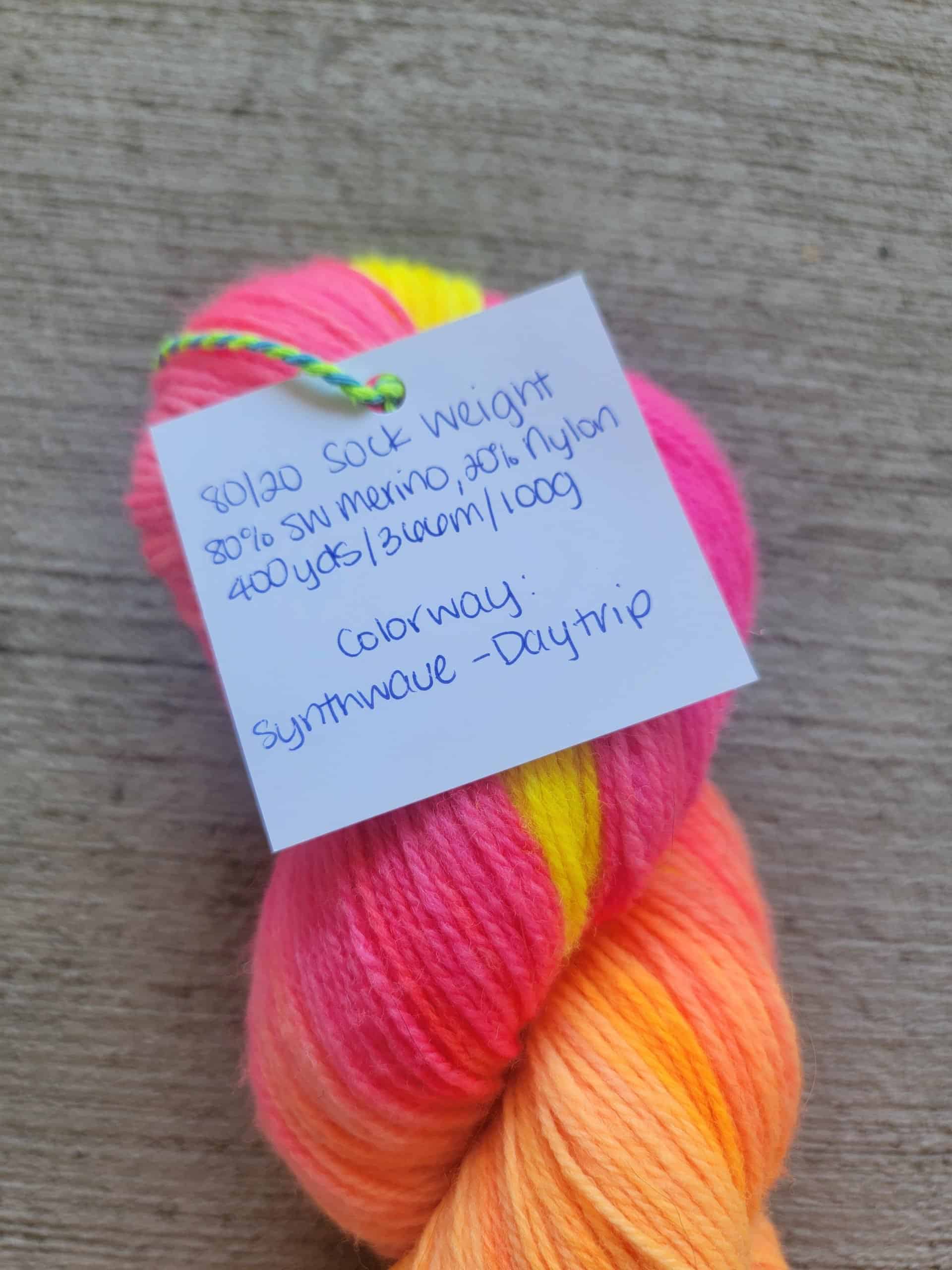 foreveratrio 1 Skein of Totally Rad Yarn June 26, 2024 SOLD OUT Tags Yarn Fingering 1 skein of Totally Rad yarn for sale $15 + shipping Yarn: Totally Rad Yarn Base: 80/20% SW Merino and Nylon Yardage: 400 yards sock weight Colorway: Synthwave Daytrip