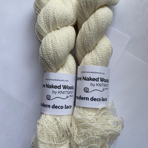 2 skeins of Bare Naked Wools by Knitspot yarn in Modern Deco Lace. Color: Titanium, lot I0001mm.