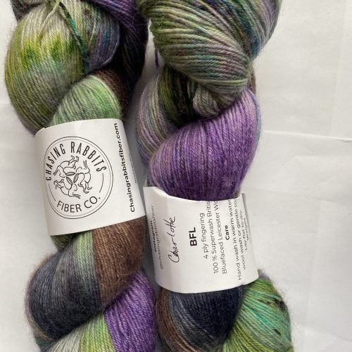 2 skeins Chasing Rabbits Fiber Co. BFL yarn. Color Charlotte. 4 ply fingering. 100% SW British Bluefaced Leicester Wool. 100g, 3.5 Oz, 437 yards.