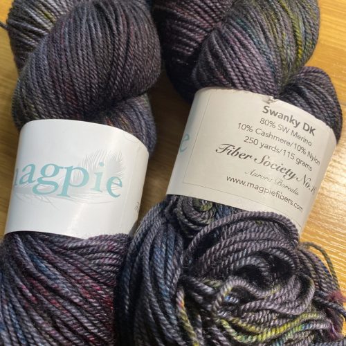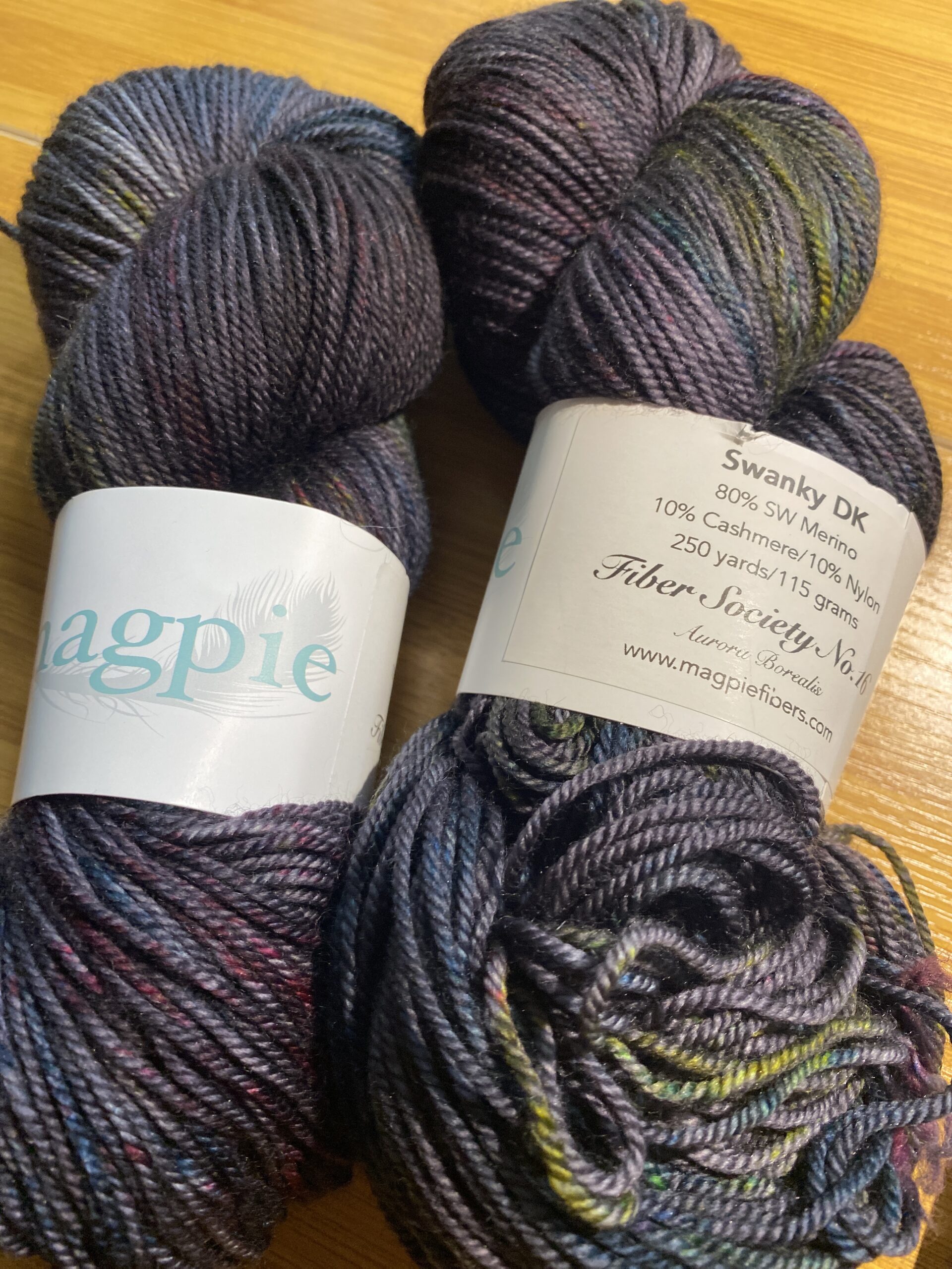 2 skeins Magpie Fibers Swanky DK yarn. Fiber Society No. 16. 80/10/10 SW Merino, cashmere, nylon. Each skein 250 yards/115 g. Color: Aurora Borealis. Only sold as set.