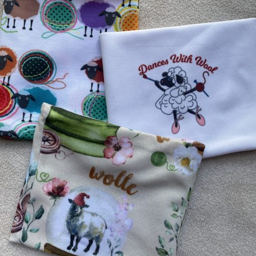 3 cake skein wraps to help your yarn from unraveling. One is multi-color with sheep and yarn. One is pale yellow base with flowers and sheep with party hats in snow globes and one has a dancing sheep