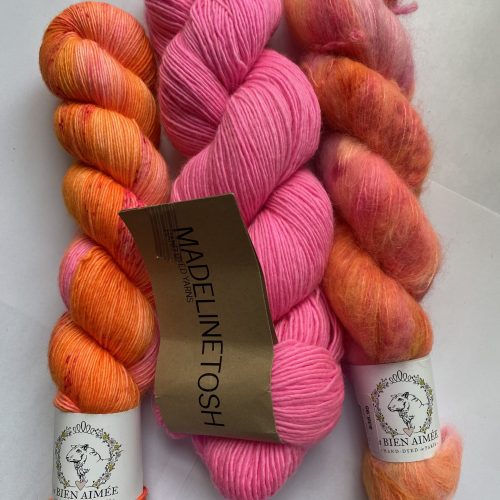 3 full skeins of neon pink and orange yarn. Sold only as a set.