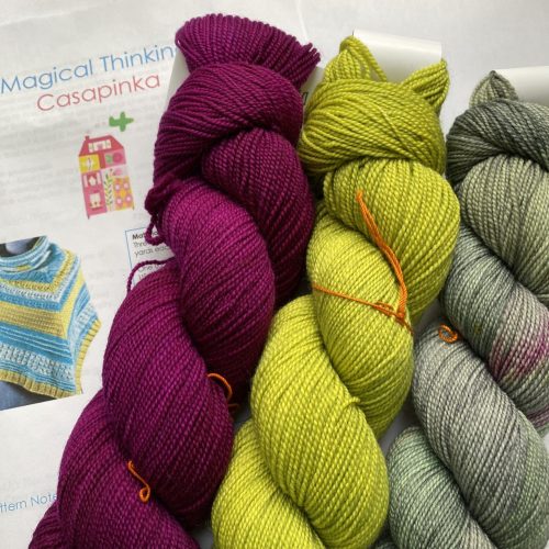 3 skeins Dragonfly Fibers Yarn and Casapinka Magical Thinking knitting pattern. Only sold as set.