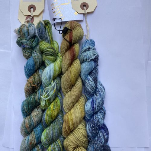 3 skeins from Mothy and the Squid – each skein is 75 SW merino/25 nylon, 84m/20g. Colors: Watery Grave, Perthshire, Inveruglas Isle