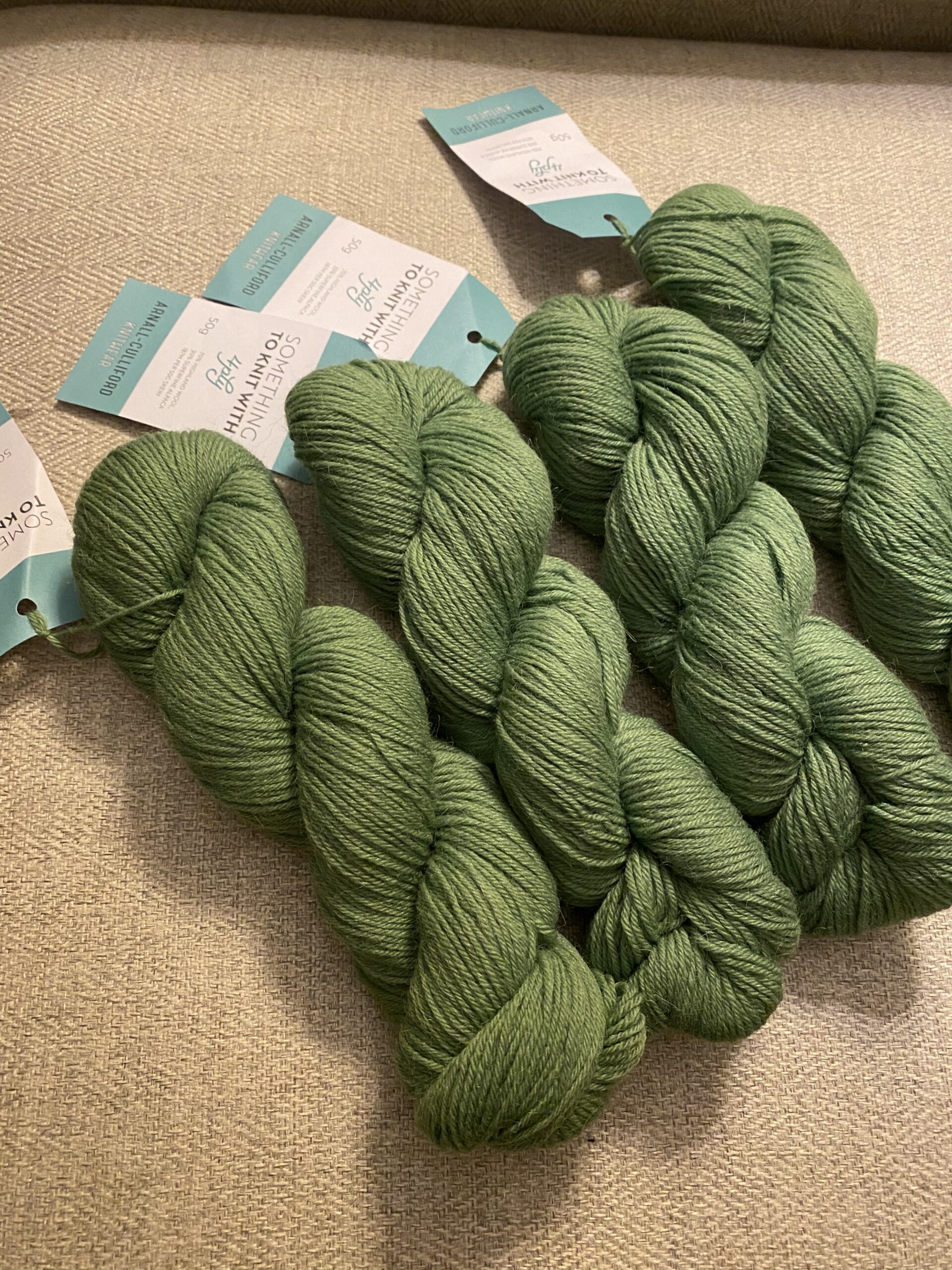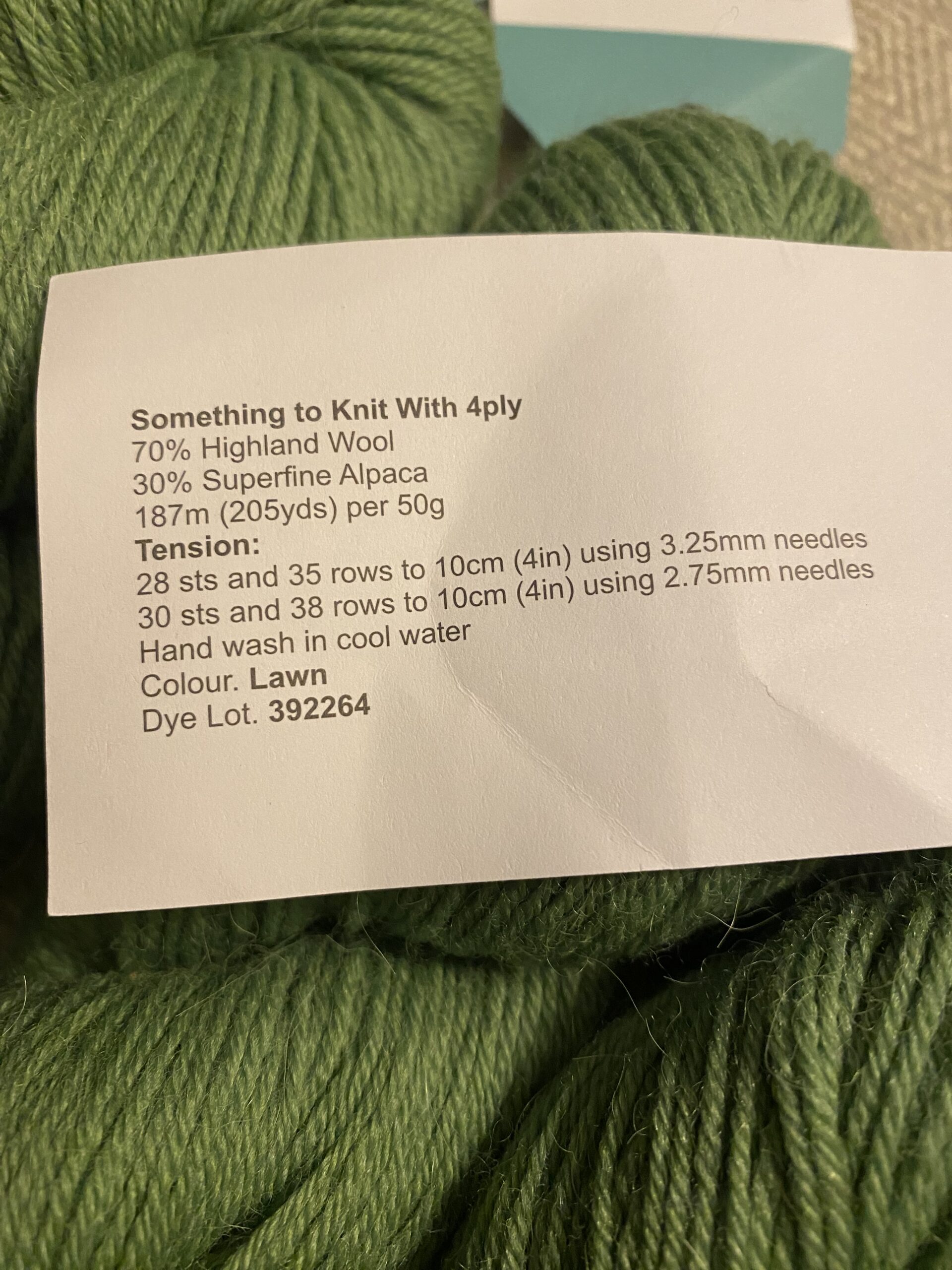 4 aliens Arnall-Culliford Knitwear – Something to Knit With 4 ply yarn. 50g / 187 M / 205 yards per skein. 70% Highland Wool, 30% Superfine Alpaca. Color: Lawn Dye Lot: 382264
