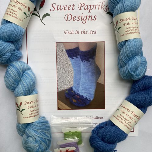 Sweet Paprika Designs – Fish in the Sea sock set. Includes 4 skeins of yarn, detail yarn and color knitting pattern.