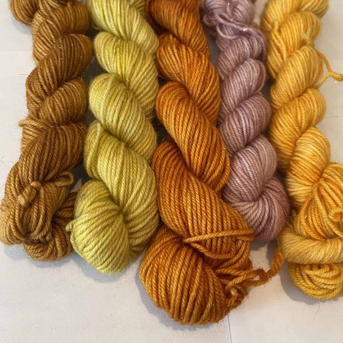 5 skein mini set of sparkle yarn. Brand unknown. Fall colors of pale yellow, golden yellow, orange, burnt orange and pale purple. Would be a gorgeous shawl!