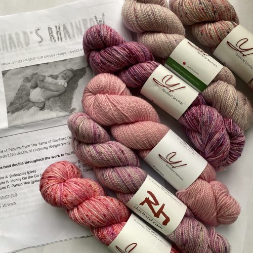 Rhichard’s Rhainbow baby blanket knitting pattern kit including black and white pattern and 6 skeins Rhichard Devrieze Peppino yarn in pink colors. Only sold as set.