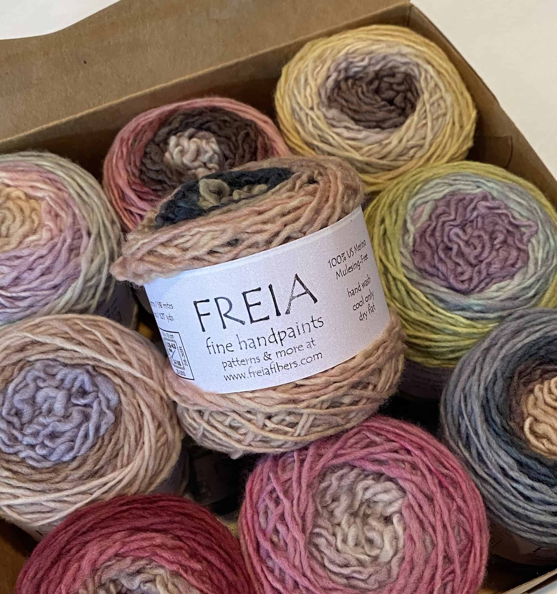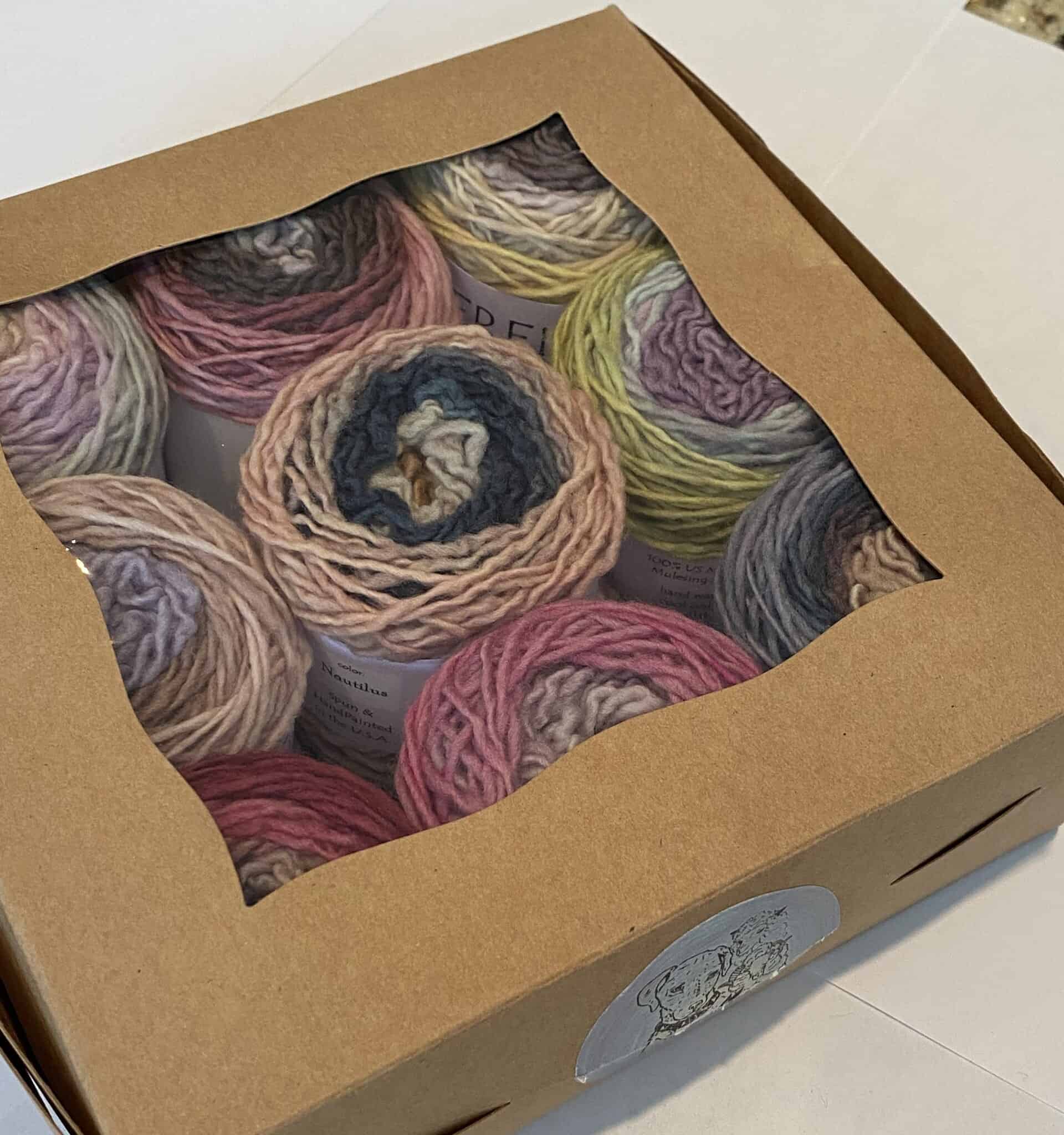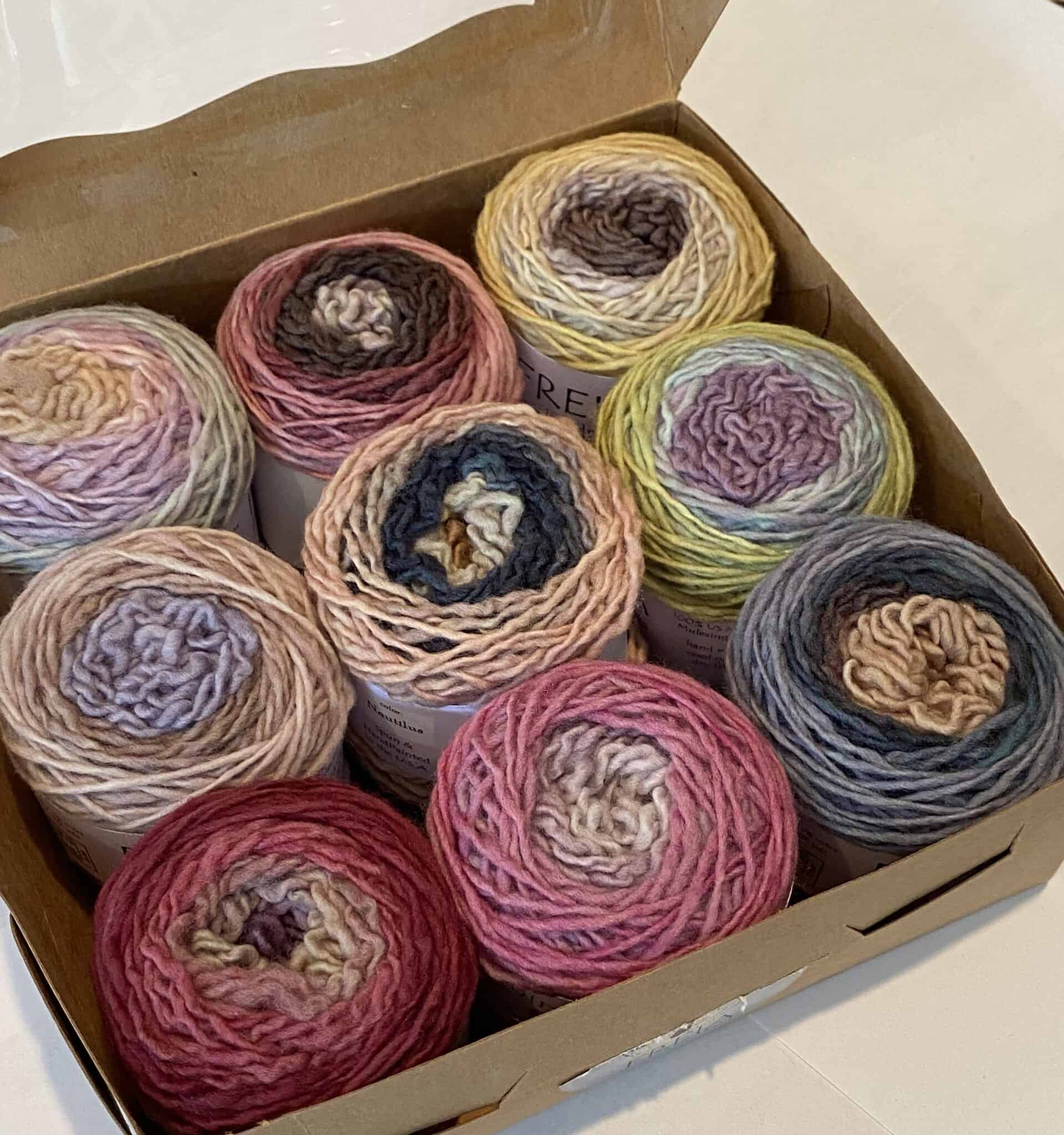 Freia hand painted yards minikins set. 9 cake skeins. Includes blanket pattern in cardboard box with clear lid.