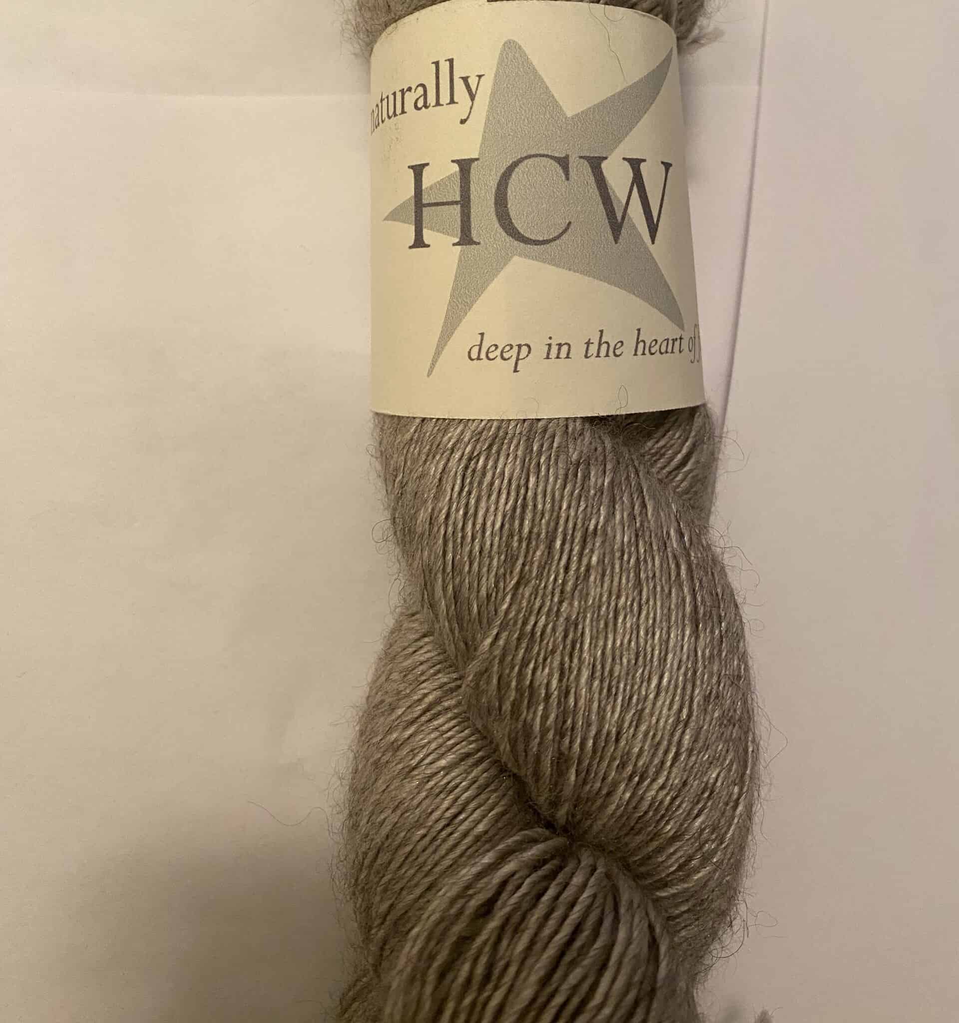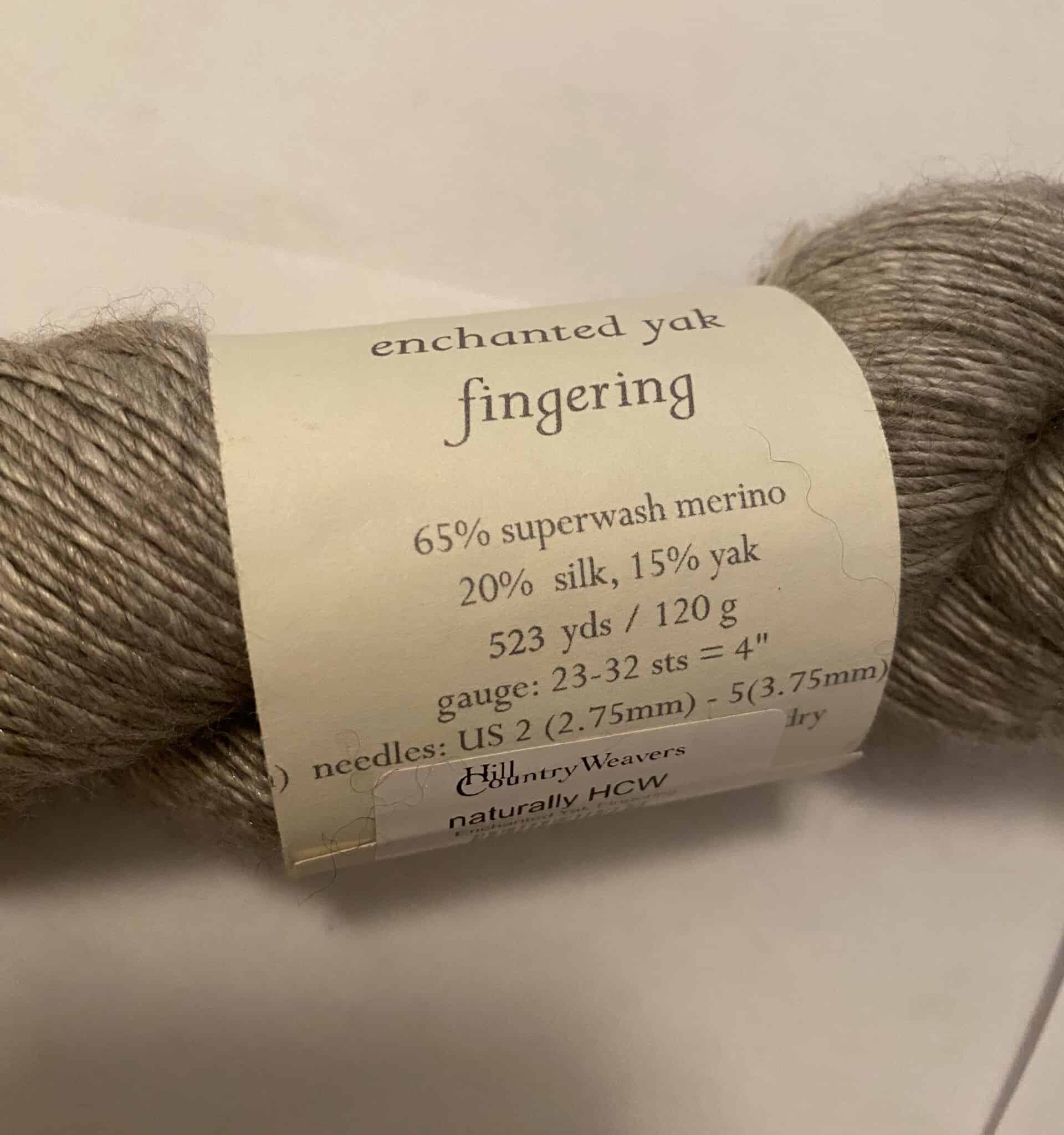 One skein of HCW Hill Country Weavers Enchanted Yak fingerling yarn. Color is grey.