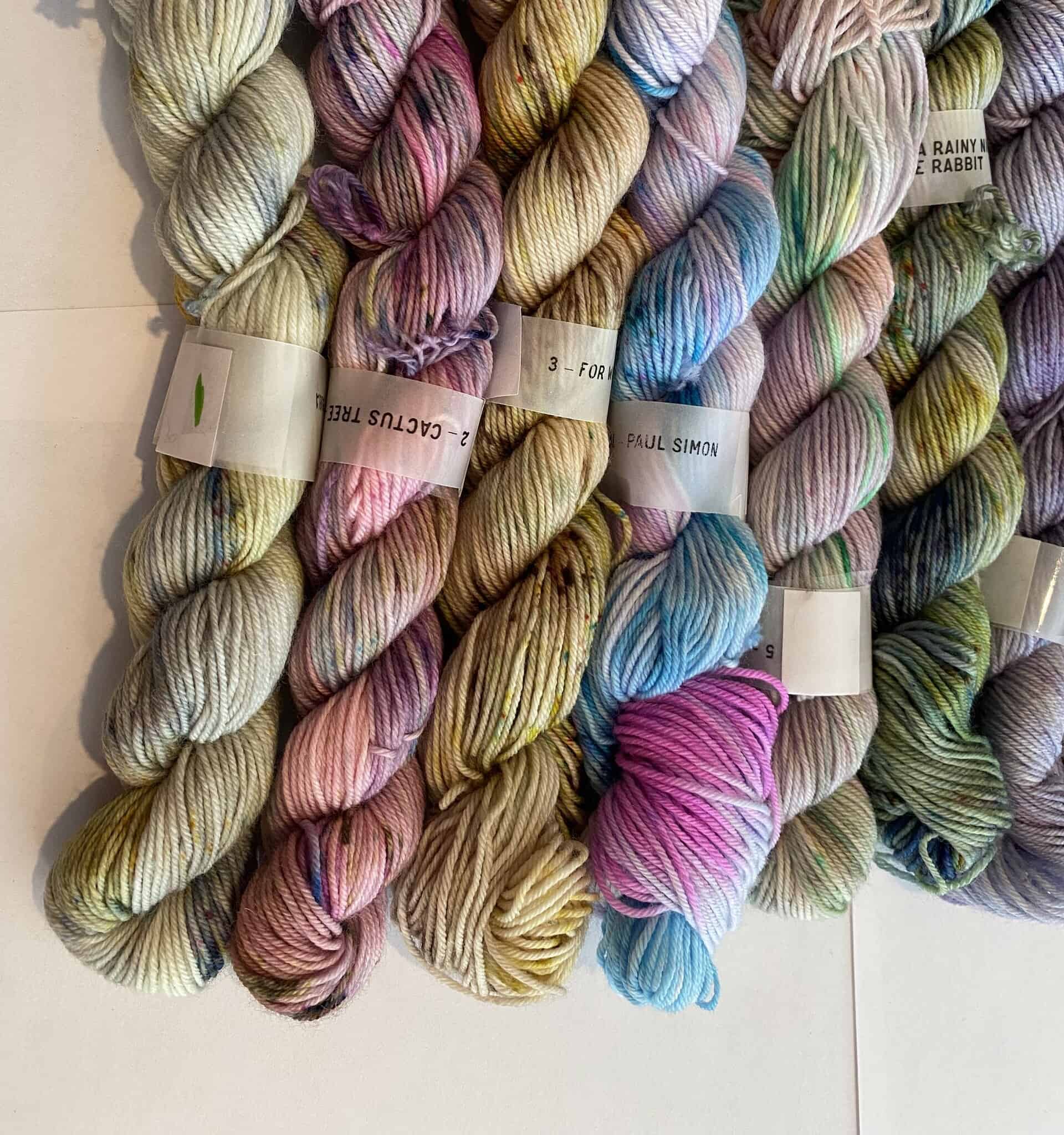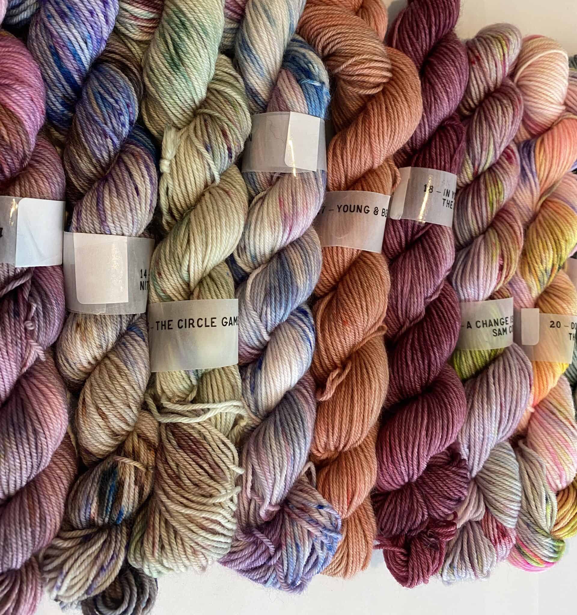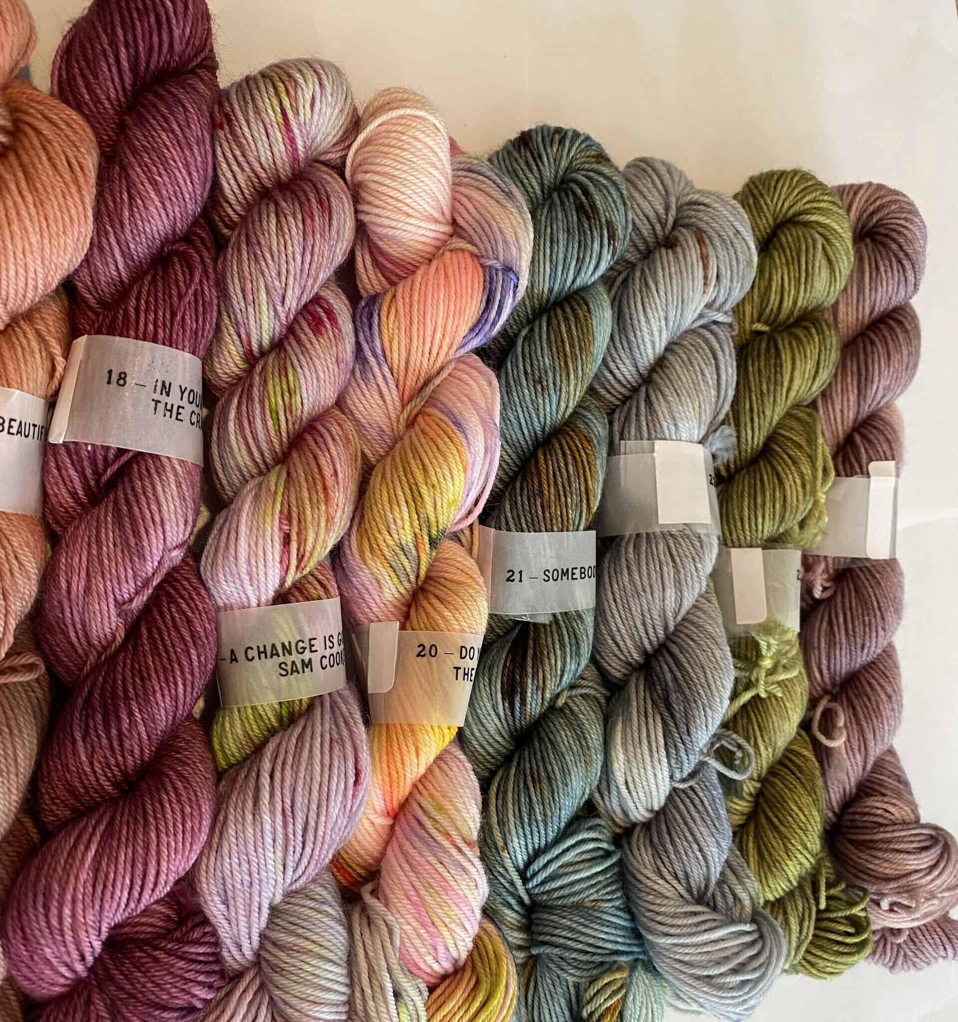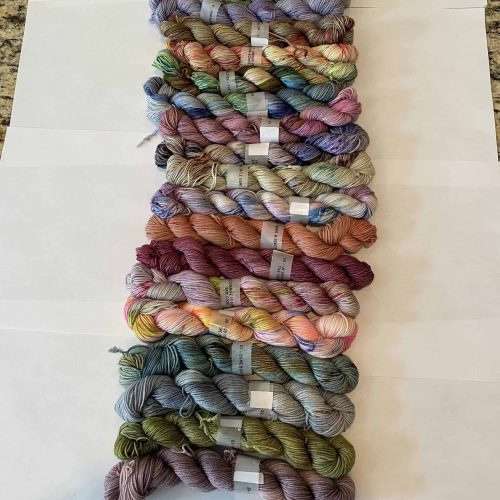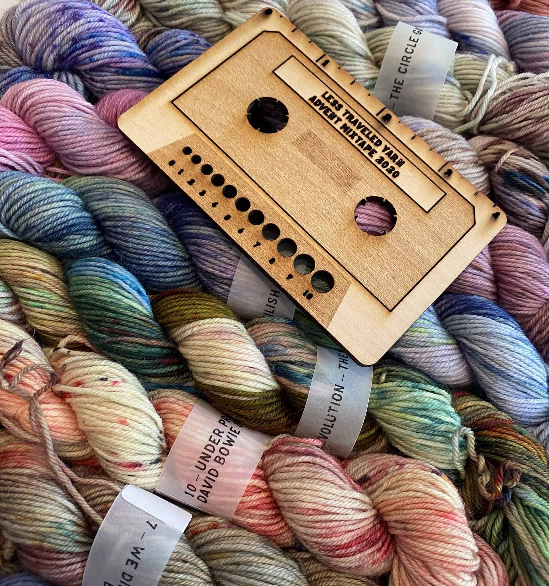 Less Traveled Yarn Advent Mix Tape 2020 set. 23 of 24 skeins included (who knows what happened to the missing Day 6). Includes cute cassette tape to measure your needle sizes. Various colors included.