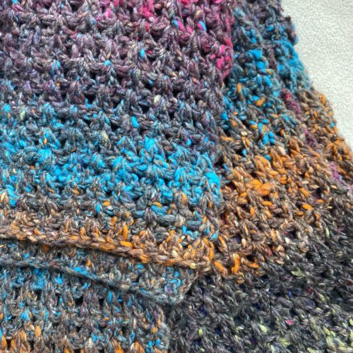 Finished crochet scarf. Wool/silk blend in dark gray and multi-color yarn. Size approx 74” x 5”.
