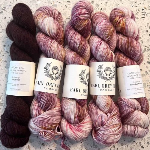 4 skeins, in “Rose Apothecary” plus one solid in “.Wingback”.