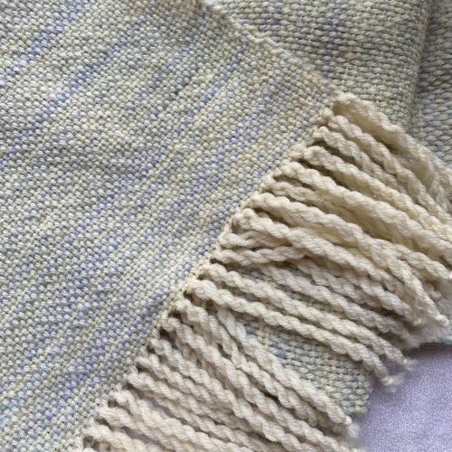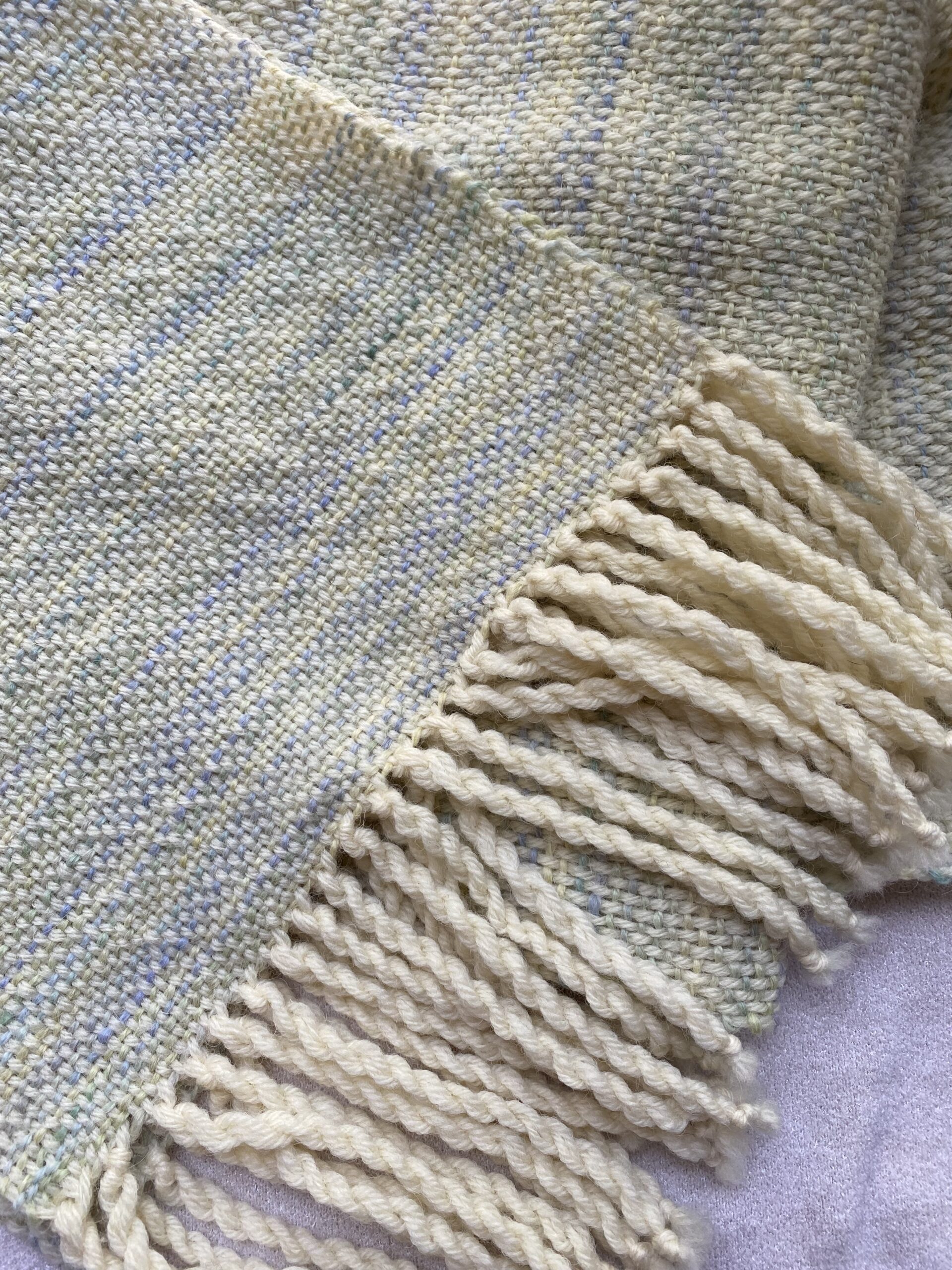 Handwoven scarf. Approx 66” x 11 1/2”. Cream, light green and light blue yarns. Wool yarn. Twisted cream yarn tassels.