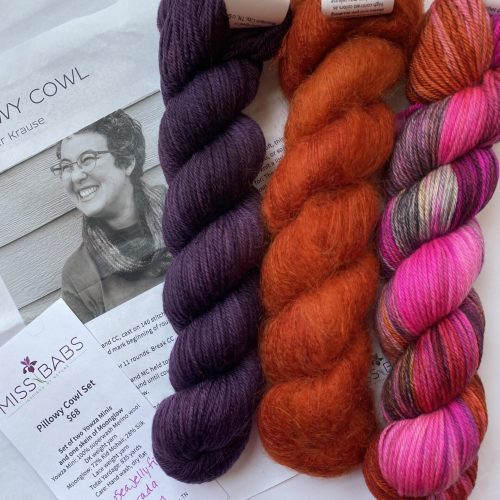 Miss Babs Pillowy Cowl kit including black and white pattern and 3 skeins of yarn.