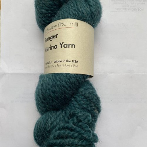 One skein Echoview Fiber Mills Ranger Merino Yarn. Color: Kingfisher Green, Lot 4. 90/10 USA Merino Wool/WNC Rambouillet Wool. 100g, 140 yards. 2 ply bulky.