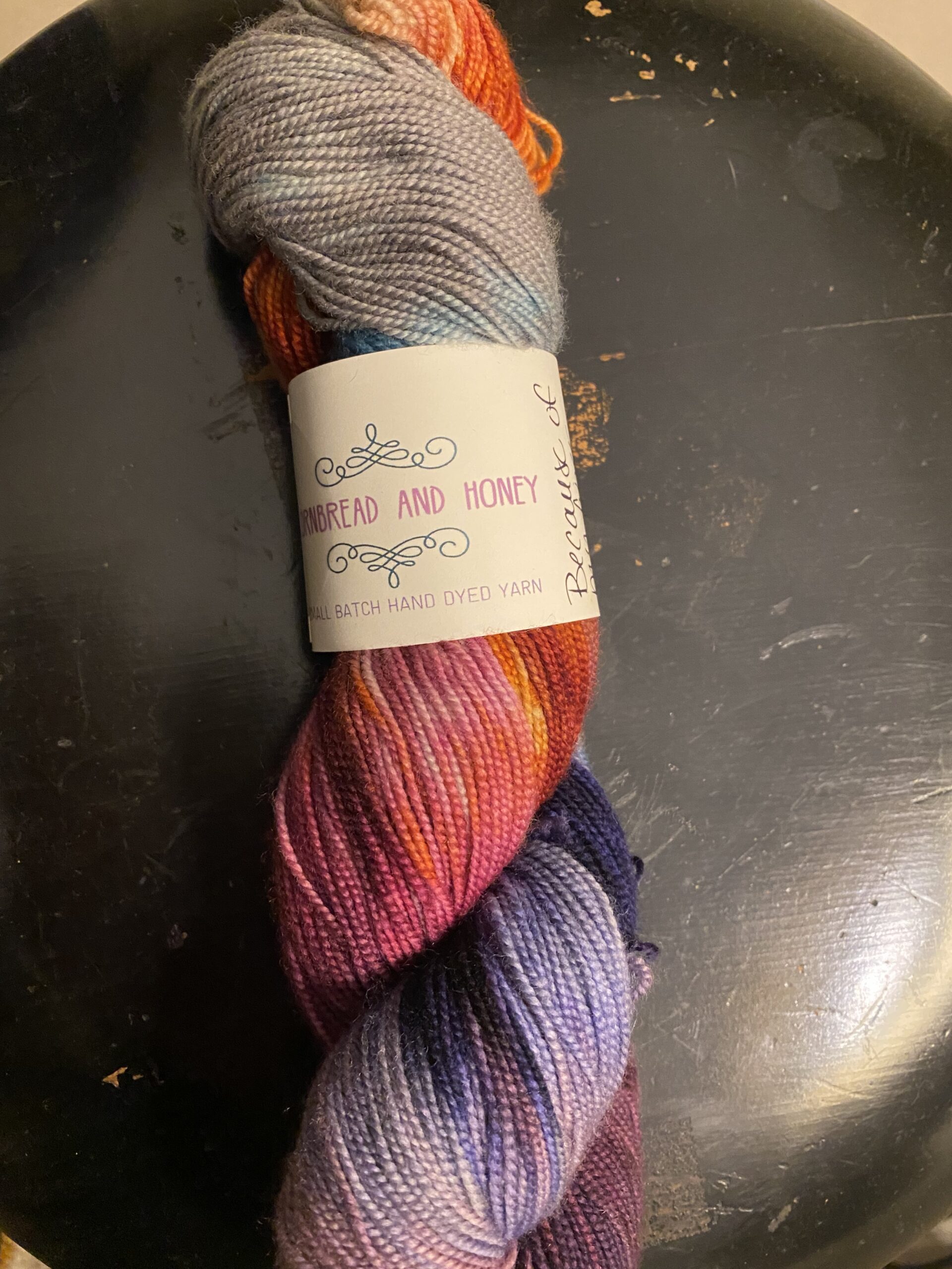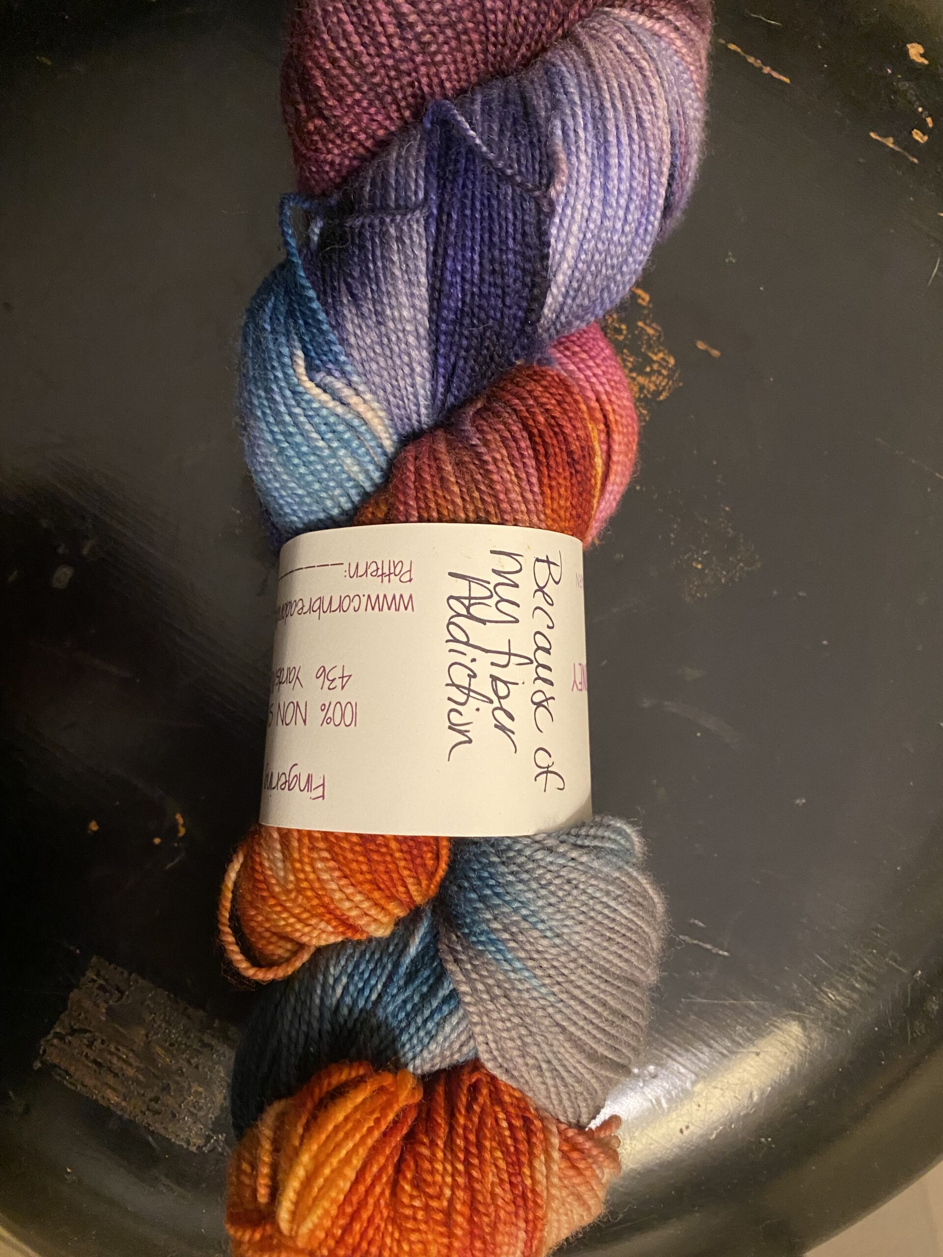 One skein Cornbread and Honey Fingerling weight yarn. Color: Because of My Fiber Addiction. 100% NON SW Merino. 436 yards, 100g