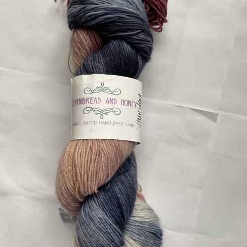 One skein Cornbread and Honey Fingering Weight Yarn. Color: Your Dark My Light. 75/25 SW merino/nylon. 463 yards, 100g.