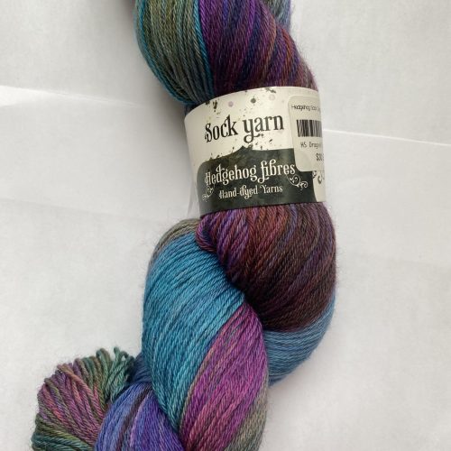 One skein Hedgehog Fibres yarn. Sock yarn. Color: Dragonfly. 100g/400m. 90% SW merino, 10% nylon.