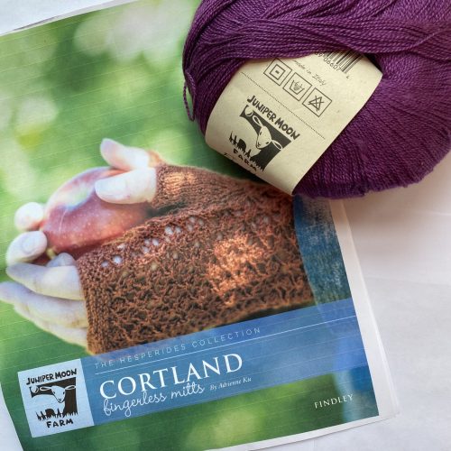 One skein Juniper Moon Farm Findley yarn and Jupiter Moon Farm Cartland Fingerless Mitts by Adrienne Ku knitting pattern. Only sold as set.