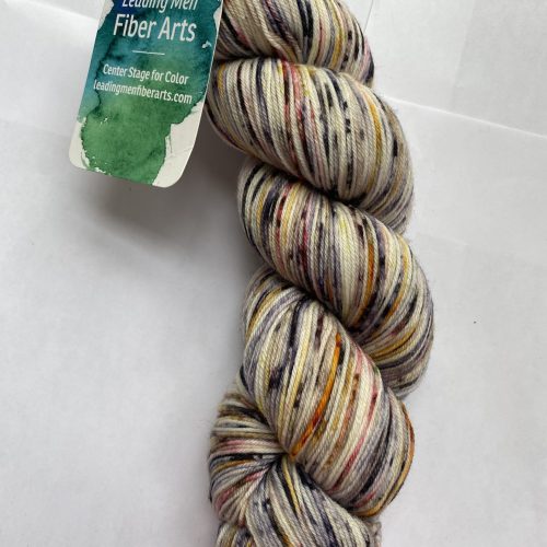 One full skein of Leading Men Fiber Arts yarn. Show Stopper. Color: Trapdoor. Fingerling. 75% SW Merino, 25% nylon. 463 yards, 100g.