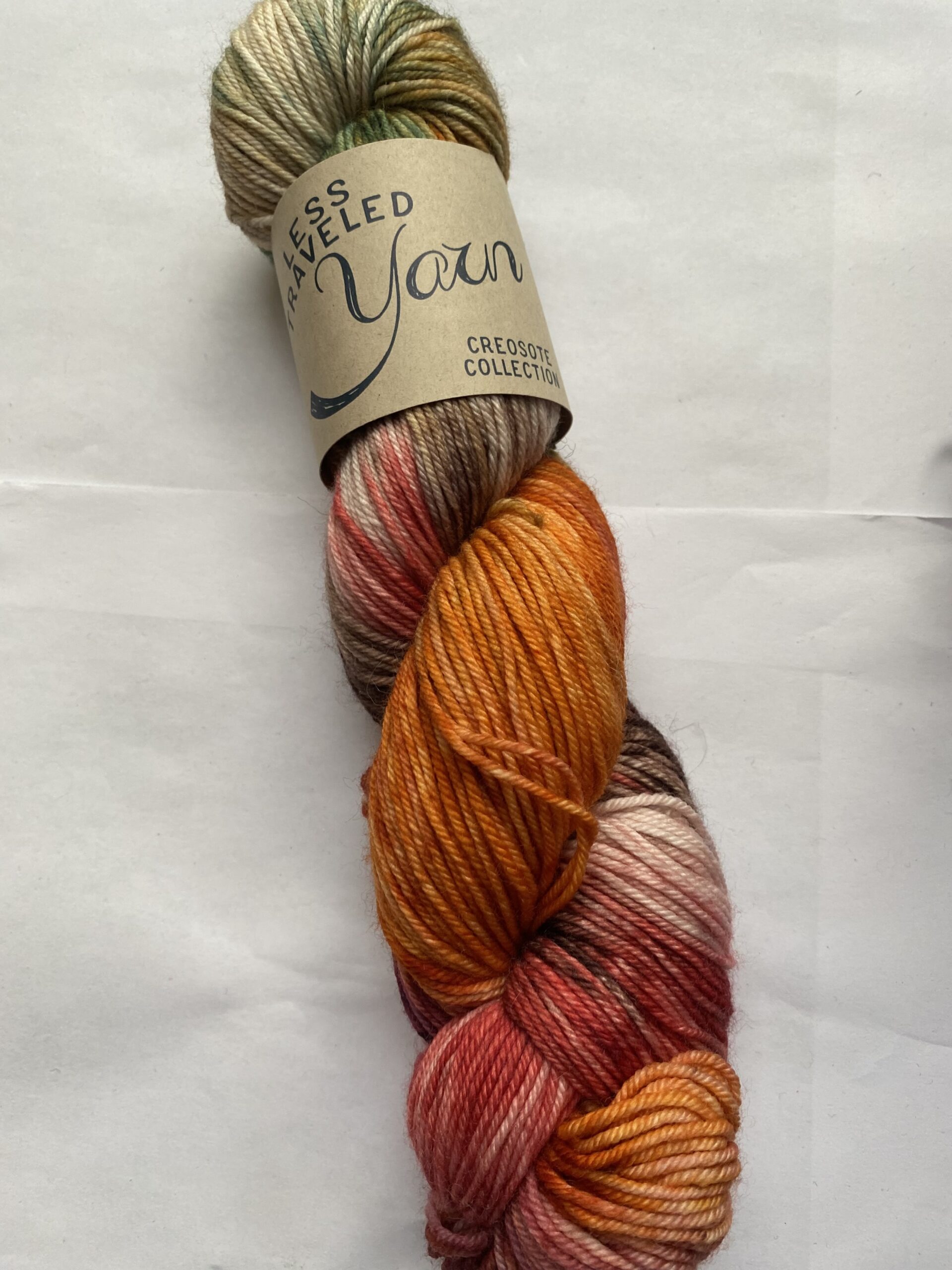 One skein Less Traveled Yarn Creosote Collection yarn. Color: Turning Leaves. DK Weight. 75/25 SW merino/nylon. 246 yards.