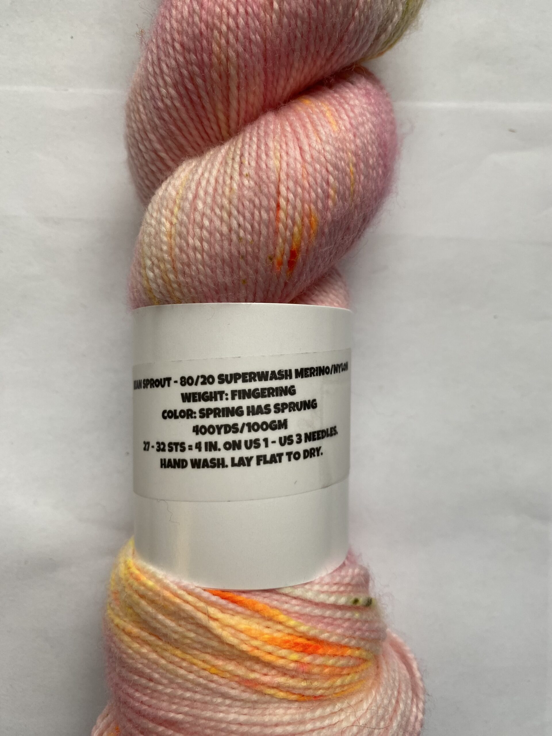 One skein Lola Bean Yarn Co. yarn. Bean Sprout – Color: Spring has Sprung. Fingering. 80/20 SW Merino/Nylon. 400 yards, 100g