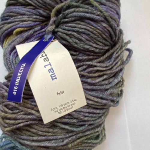 One skein Malabrigo Twist yarn. Color 416 Indiecita. Color is a variegated green, yellow and blue. 150 yards/3.5 Oz. 100% pure baby merino wool.