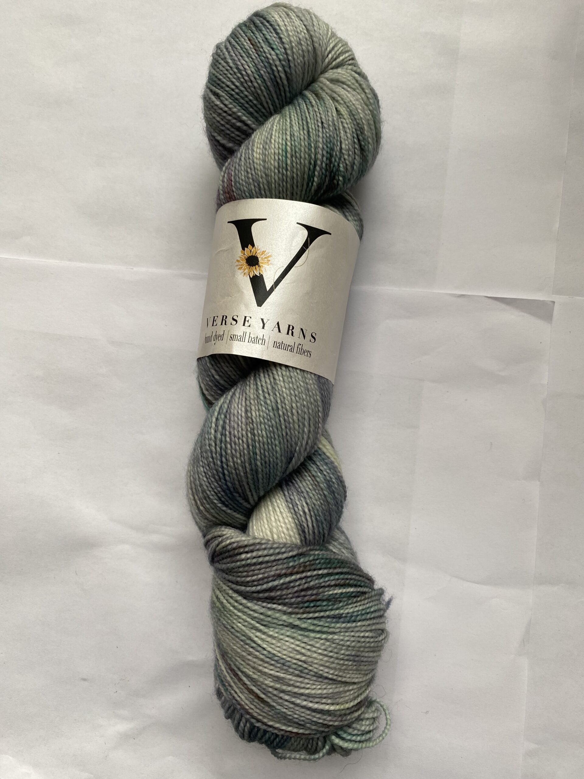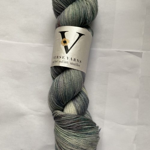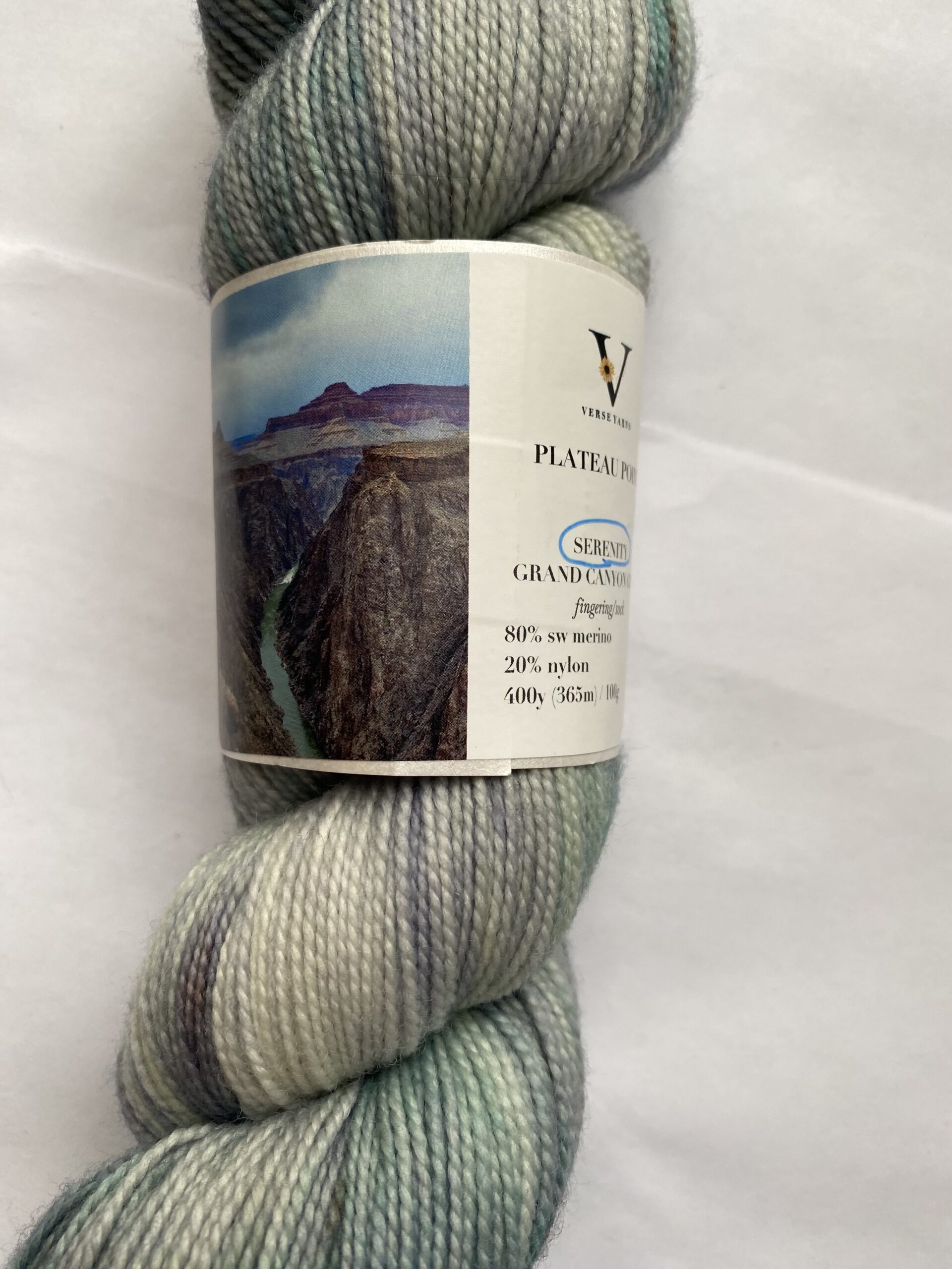 One skein Verse Yarns – Plateau Point yarn. Indie Untangled National Park selection for the Grand Canyon. Color: Serenity Grand Canyon Gray. Fingerling. 80/20 SW Merino/Nylon. 400 yards, 100g.