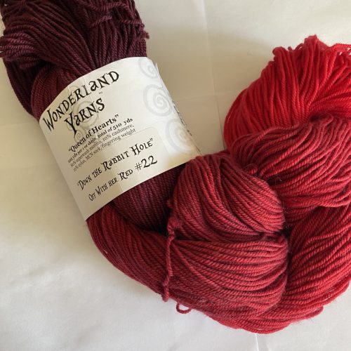 One skein Wonderland Yarns, Queen of Hearts yarn. Color – Down the Rabbit Hole, Off with her Red #22.