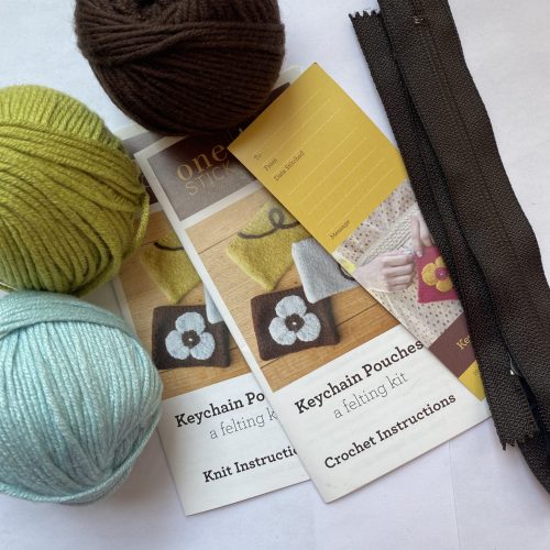 One Stick Two Stick Keychain Pouch kit. Color crochet or knitting instructions. 3 skeins of yarn – brown, green and blue. No fiber, weight or yardage noted. Also includes 3 zippers.