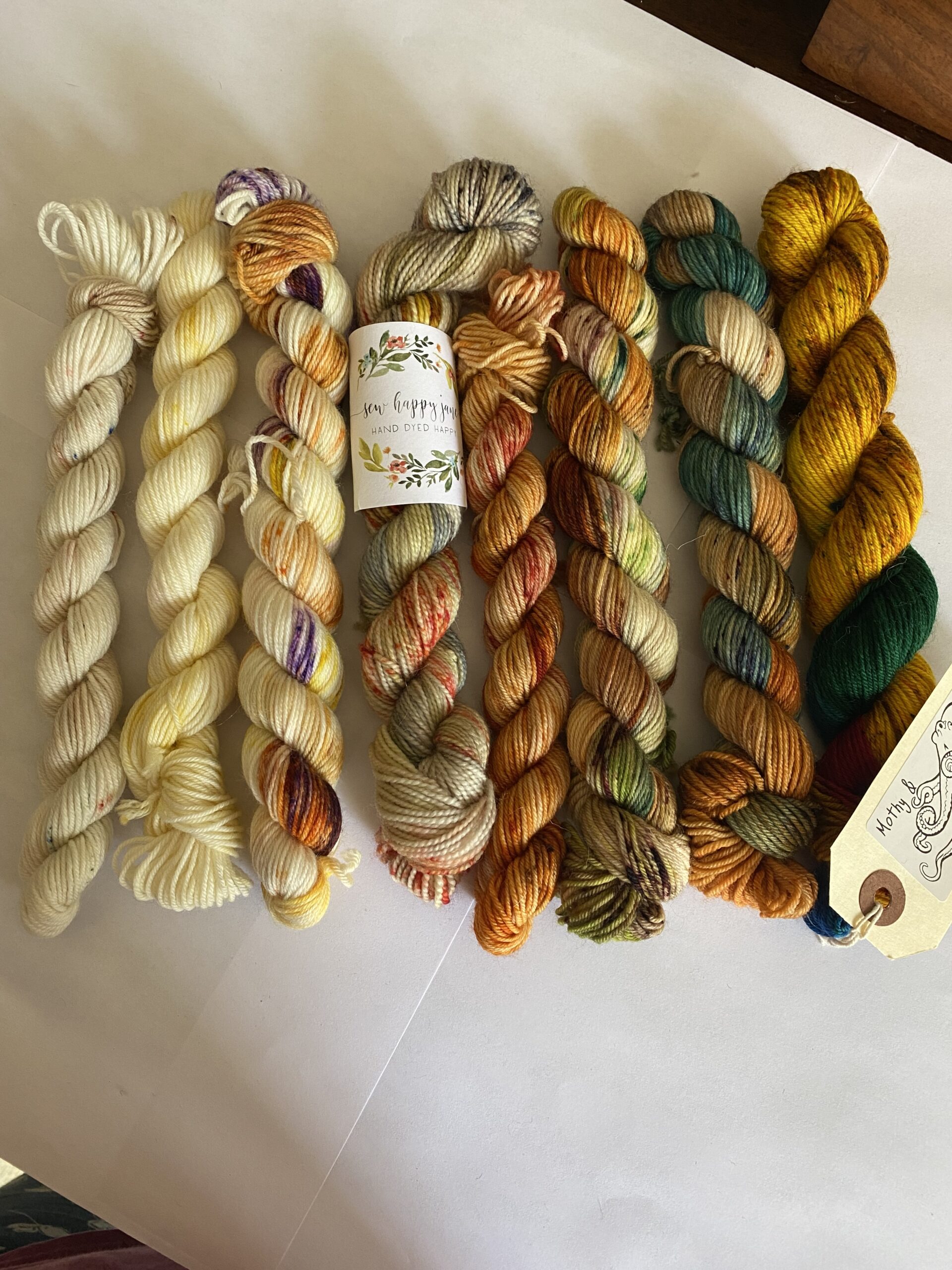 Yarn appears to be all fingerling, Merino/nylon, approximately 80-90 yards per skein.
