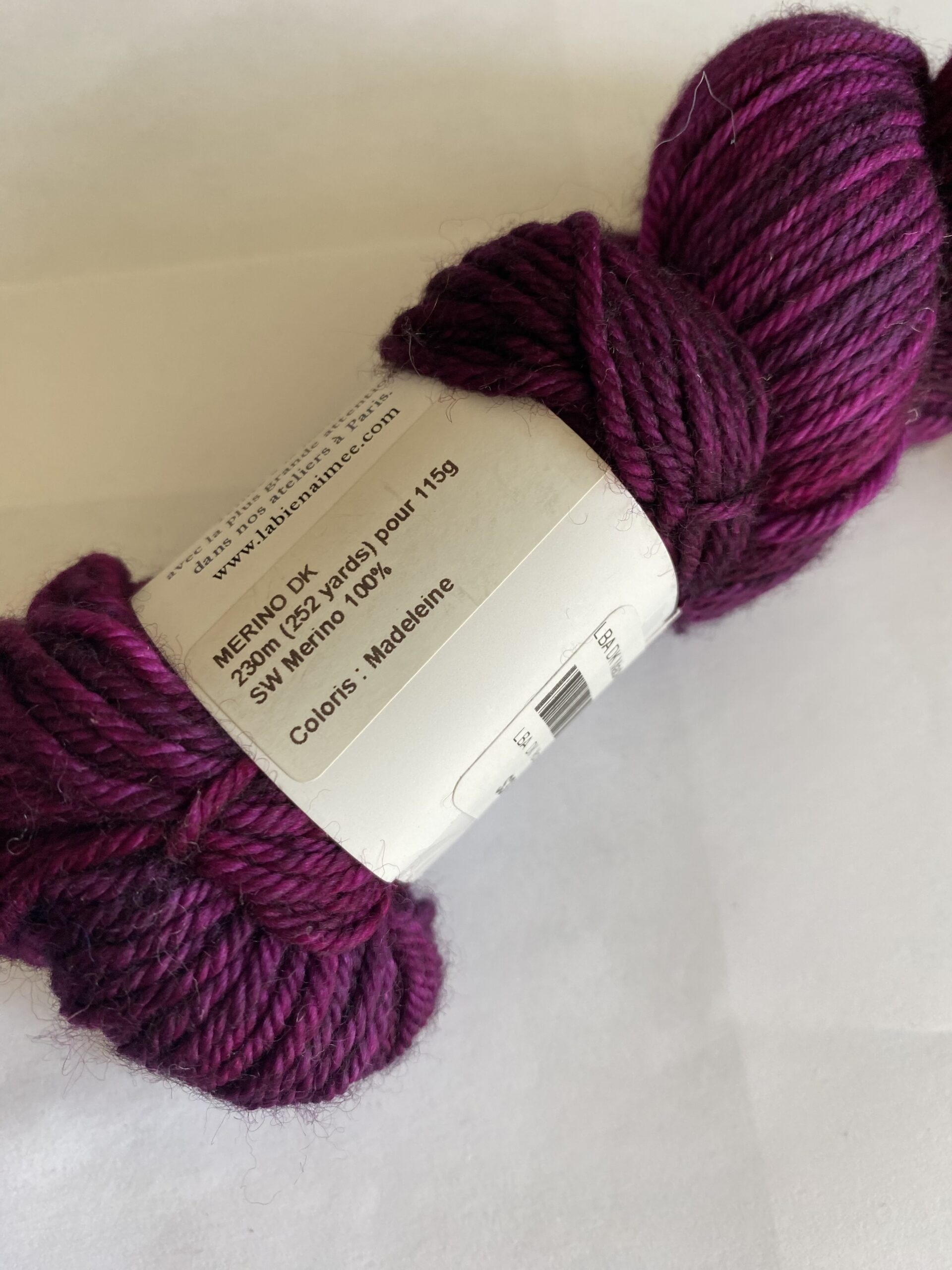 Six mini skeins of pink, green, blue, gray yarn. Only one skein is marked with vendor info. Other 5 yarn makers are unknown as yarn as not tagged.