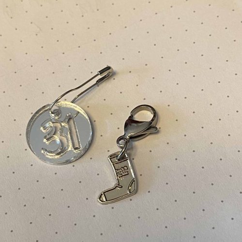 Set of two holiday stitch markers. Only selling as a set of 2. Acrylic 31 (for December 31) and silver “sock it to me” stocking with claw clasp. Would be great holiday gift with a skein of yarn!