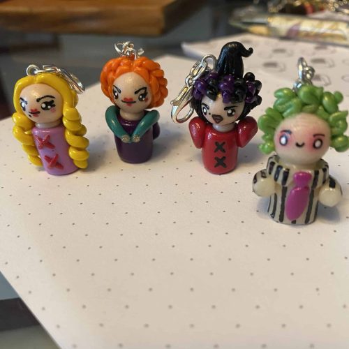 Set of 4 Hocus Pocus and Beetlejuice stitch markers. Only selling as a set of 4. Acrylic figurines of 3 sisters in Hocus Pocus movie plus Beetlejuice. Would make a great Halloween gift.