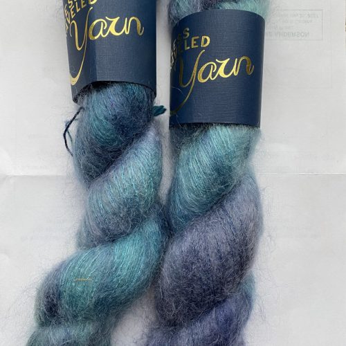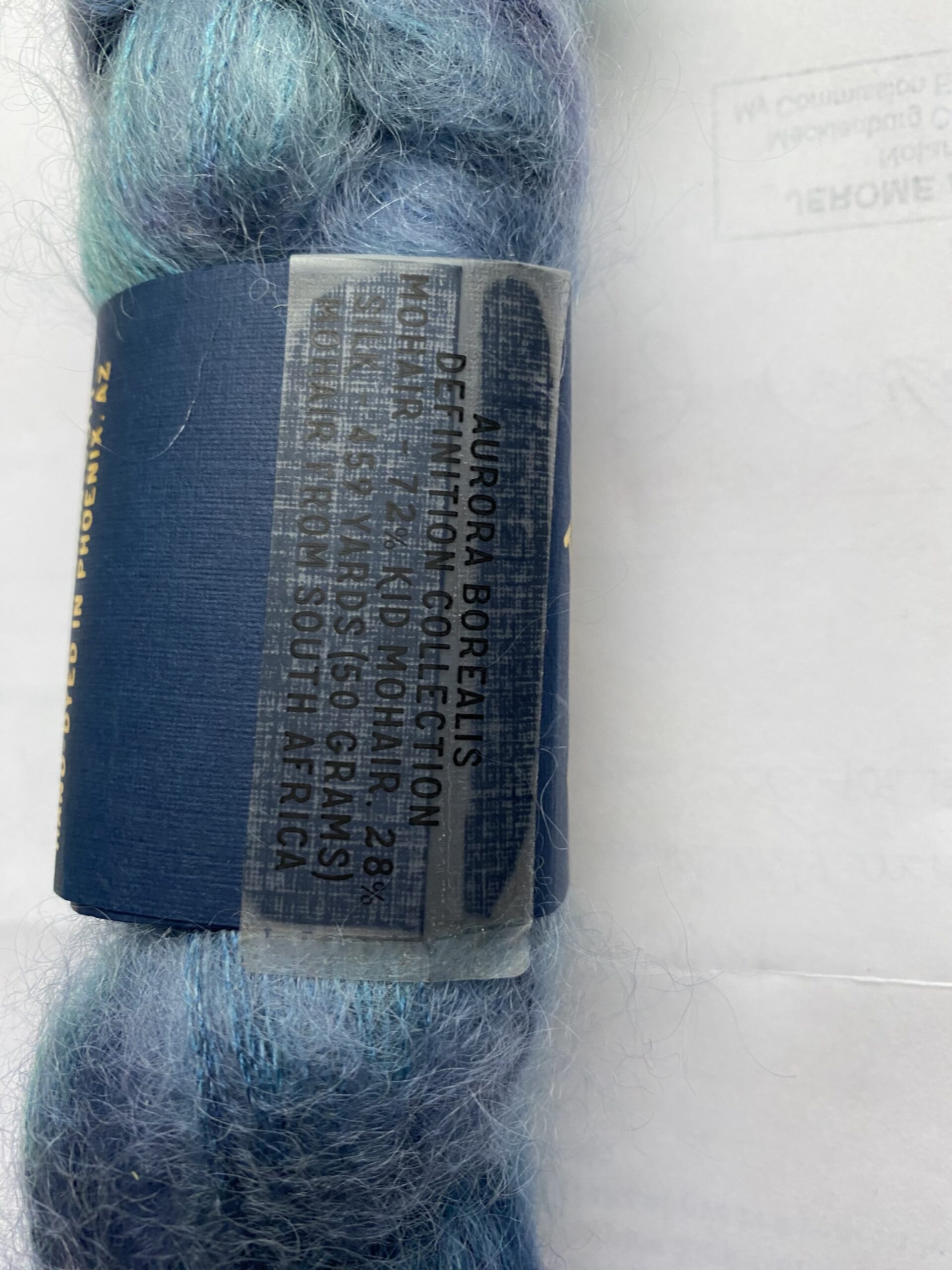 Two skeins Less Traveled Yarn Definition Collection yarn. Color: Aurora Borealis. 75/25 Kid Mohair/Silk. 459’yards, 50g each. Only sold as a set.