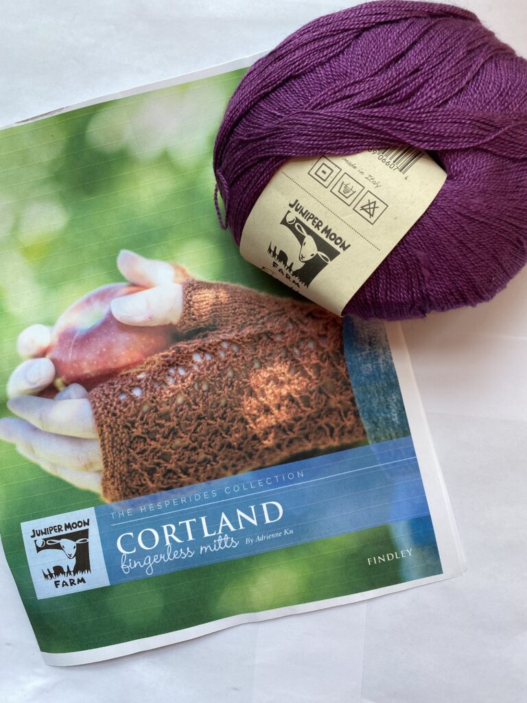 One skein Juniper Moon Farm Findley yarn and Jupiter Moon Farm Cartland Fingerless Mitts by Adrienne Ku knitting pattern. Only sold as set.