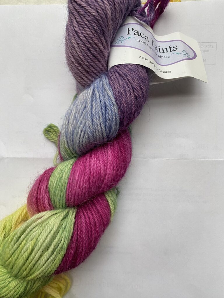 One skein The Alpaca Yarn Company yarn. Paca Paints 100% Superfine Alpaca. Color:405 Playful. 3.5oz, 100g, 220 yards.