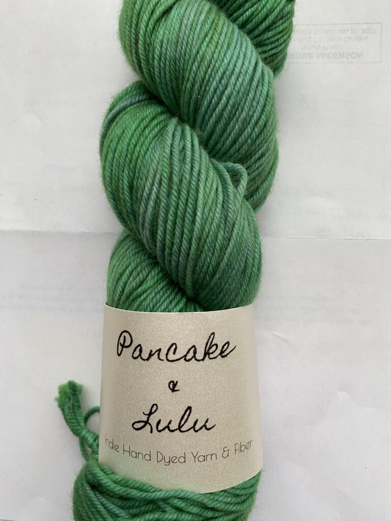 One skein Pancake and LuLu Ply DK yarn. Color: Green Algae. 100% SW Merino. 100g, 3.5oz, 211m, 231 yards.