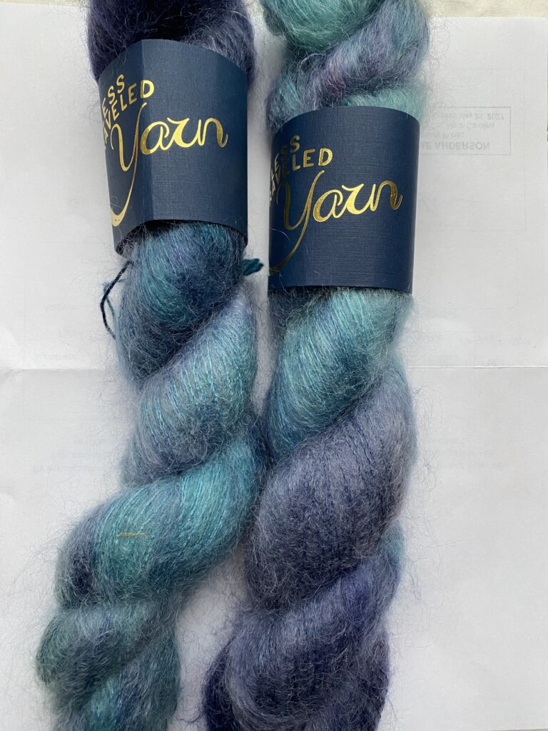 Two skeins Less Traveled Yarn Definition Collection yarn. Color: Aurora Borealis. 75/25 Kid Mohair/Silk. 459’yards, 50g each. Only sold as a set.