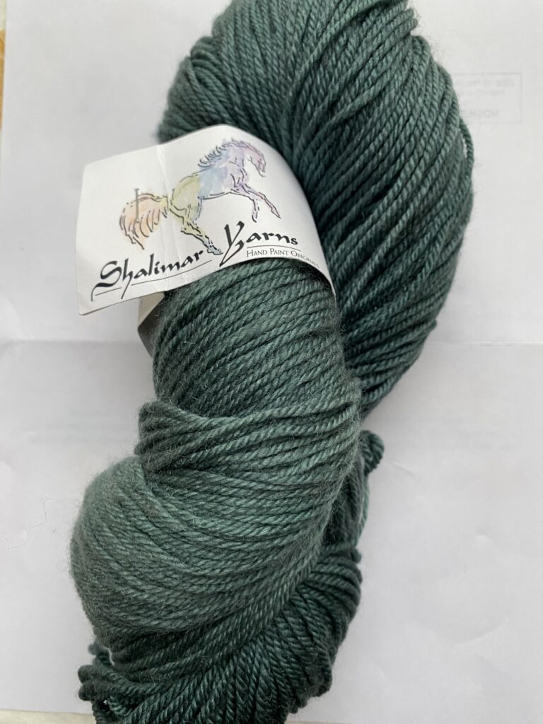 One skein Shalimar Yarns Breathless yarn. Color: Scarab. 75/15/10 SW Merino/Cashmere/Silk. 420 yards, 4oz.
