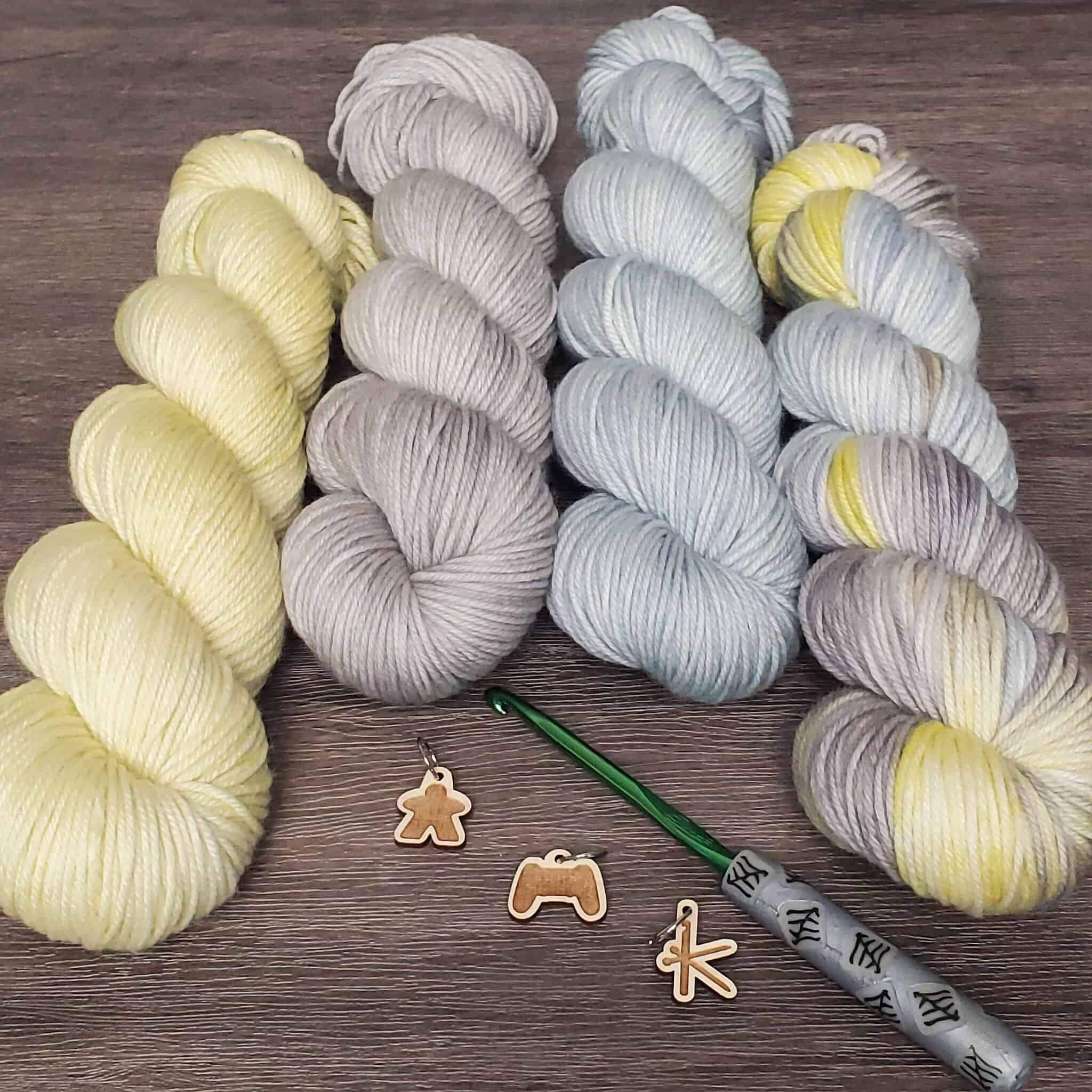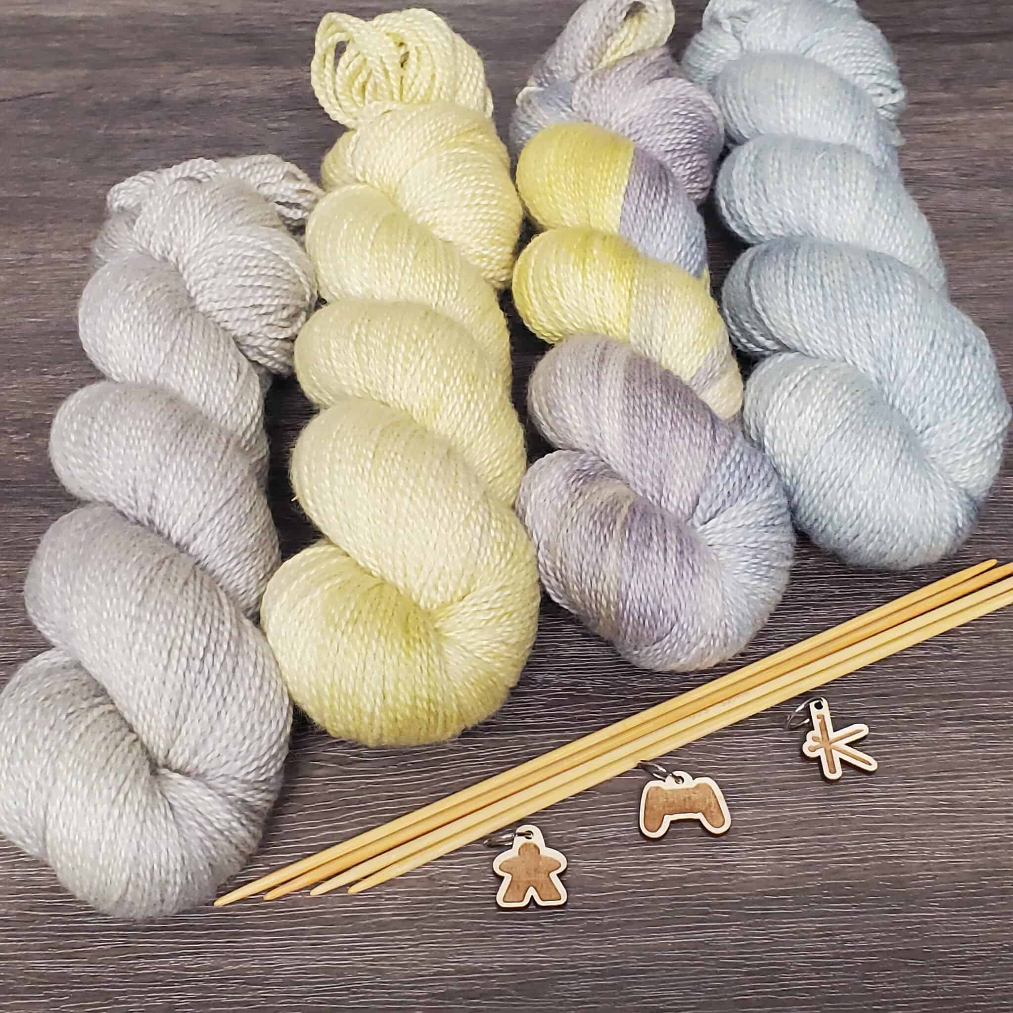 Twilight Into Winter – This variegated colorway captures that quiet transition perfectly. Bright and pale yellows flicker like the last traces of sunlight, while multiple shades of gray settle in like gathering dusk. A muted, wintry blue weaves through it all, cooling the palette and anchoring the warmth. The result is layered, atmospheric, and gently dramatic.