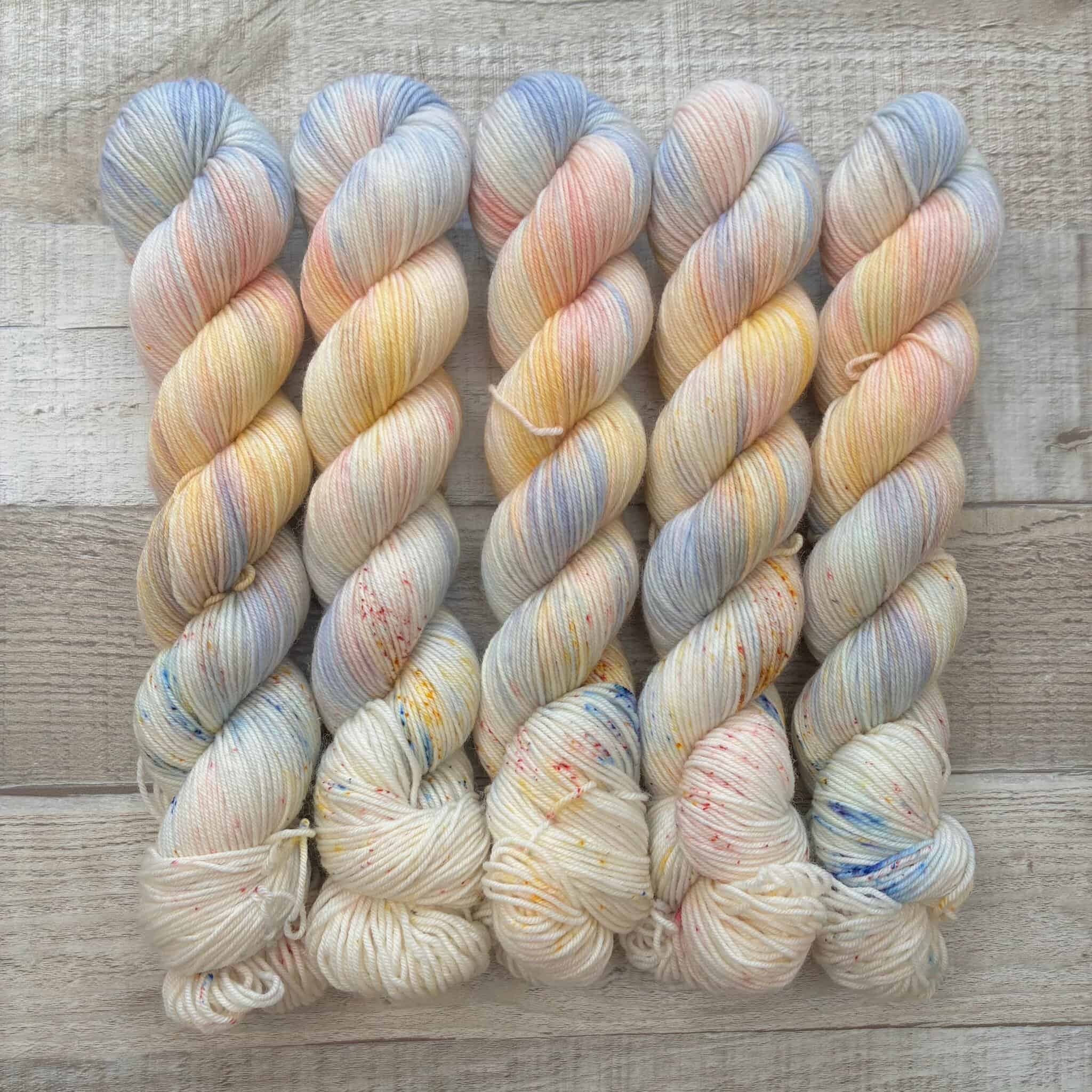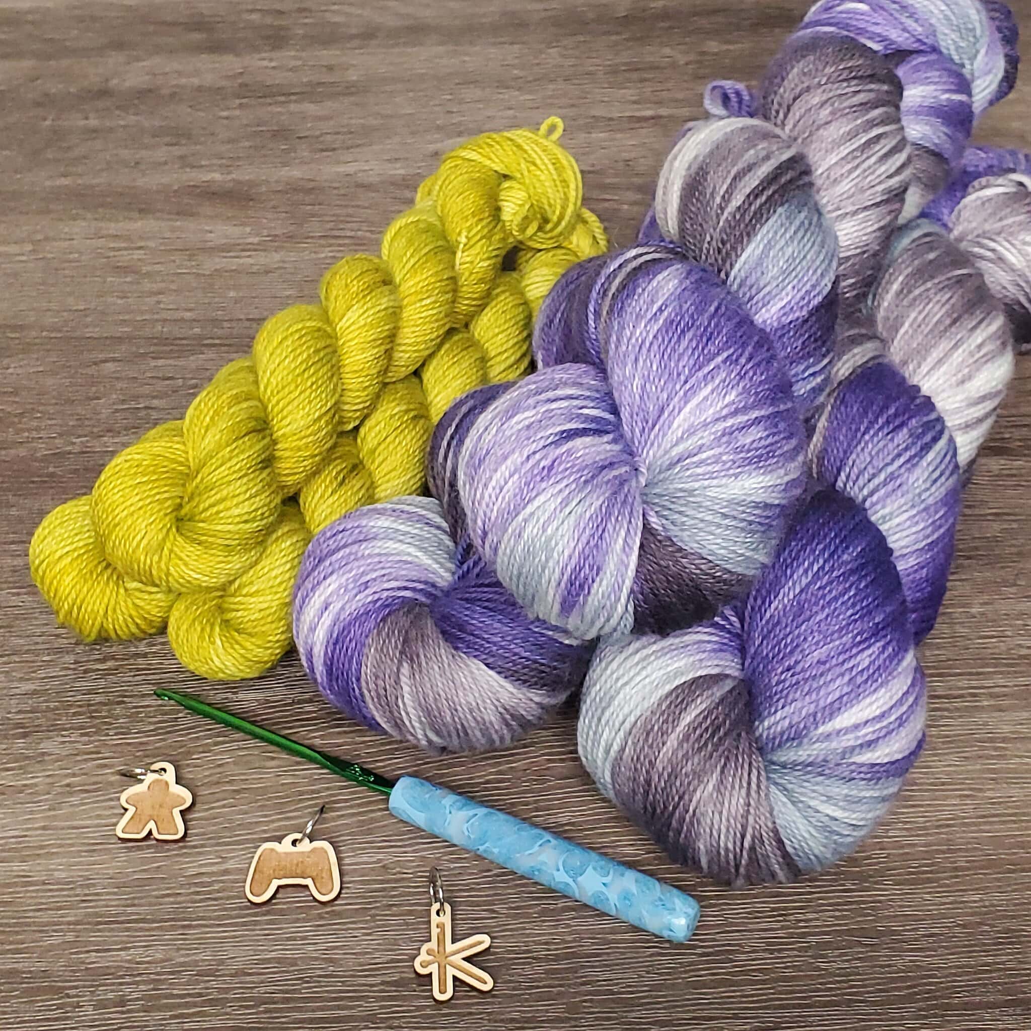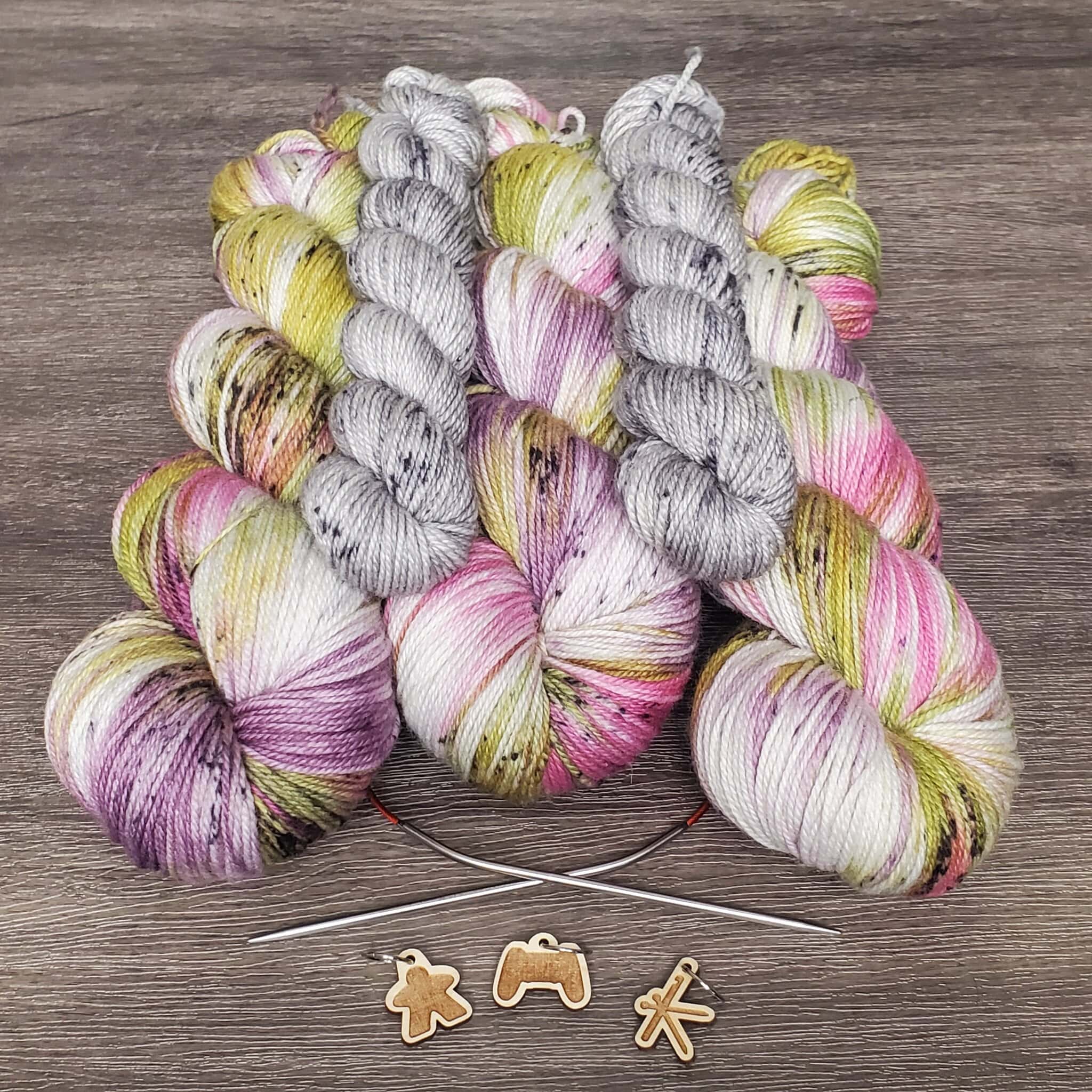 Gacha sets have become one of my favorite ways to explore color. Each set includes one 115g skein and one 25g mini skein dyed on my 80/20 Superwash Merino wool/nylon base. They’re fantastic for socks or any accessories where a playful blending of colors can take center stage.