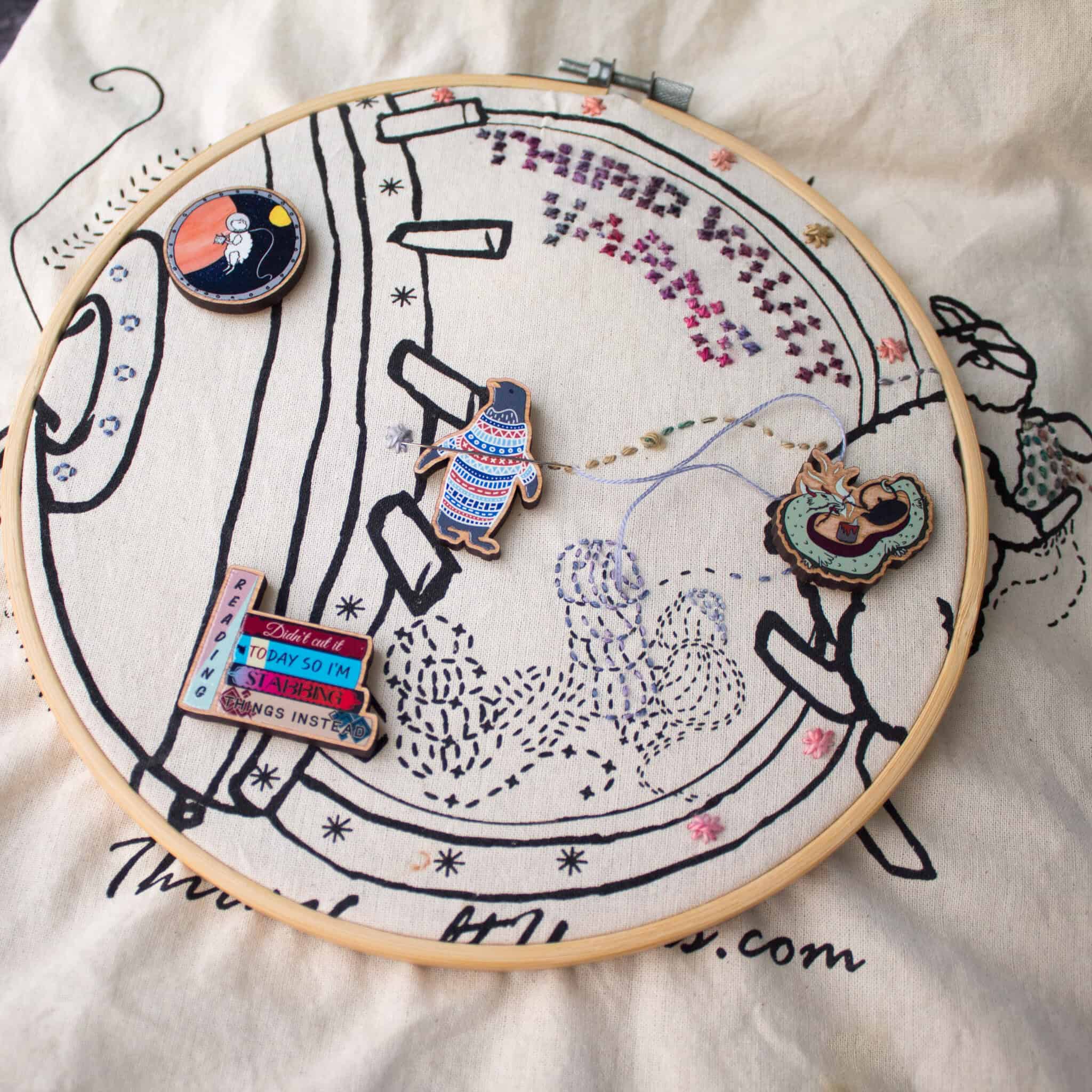 New to Third Vault Yarns are these super cute needleminders, designed by myself and our wonderful logo artist Sophie. These are sustainably printed on 3mm cherrywood veneer and come with an attached magnet and a backing magnet.