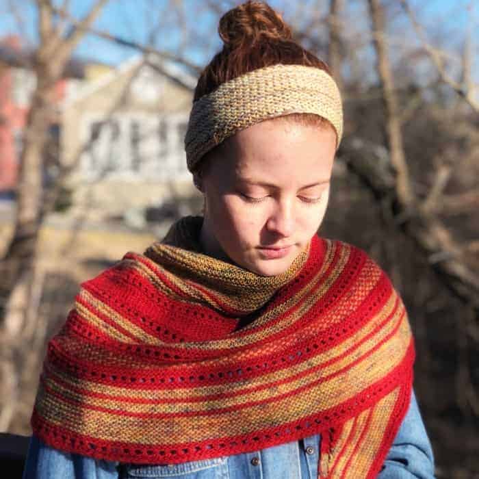 It’s fingering weight, so any fingering weight yarn that’s at least 400 yards per skein will do; it doesn’t even matter if they’re the same ply or fiber blend. I bet we all have skeins in our stashes we can mix and match for this design, and I think mixing plies, and/or different fiber blends, would be fabulous — give it some different textures as well as colors. Use a single-ply for one skein, and a multi-ply for the other. Perhaps one skein 100% silk, and the other a blend of wool, Cashmere, silk, yak or some other protein fiber. The only thing I’d not recommend is mixing protein fibers with plant fibers, simply because they are SO different, and don’t block —or stay blocked — the same way.