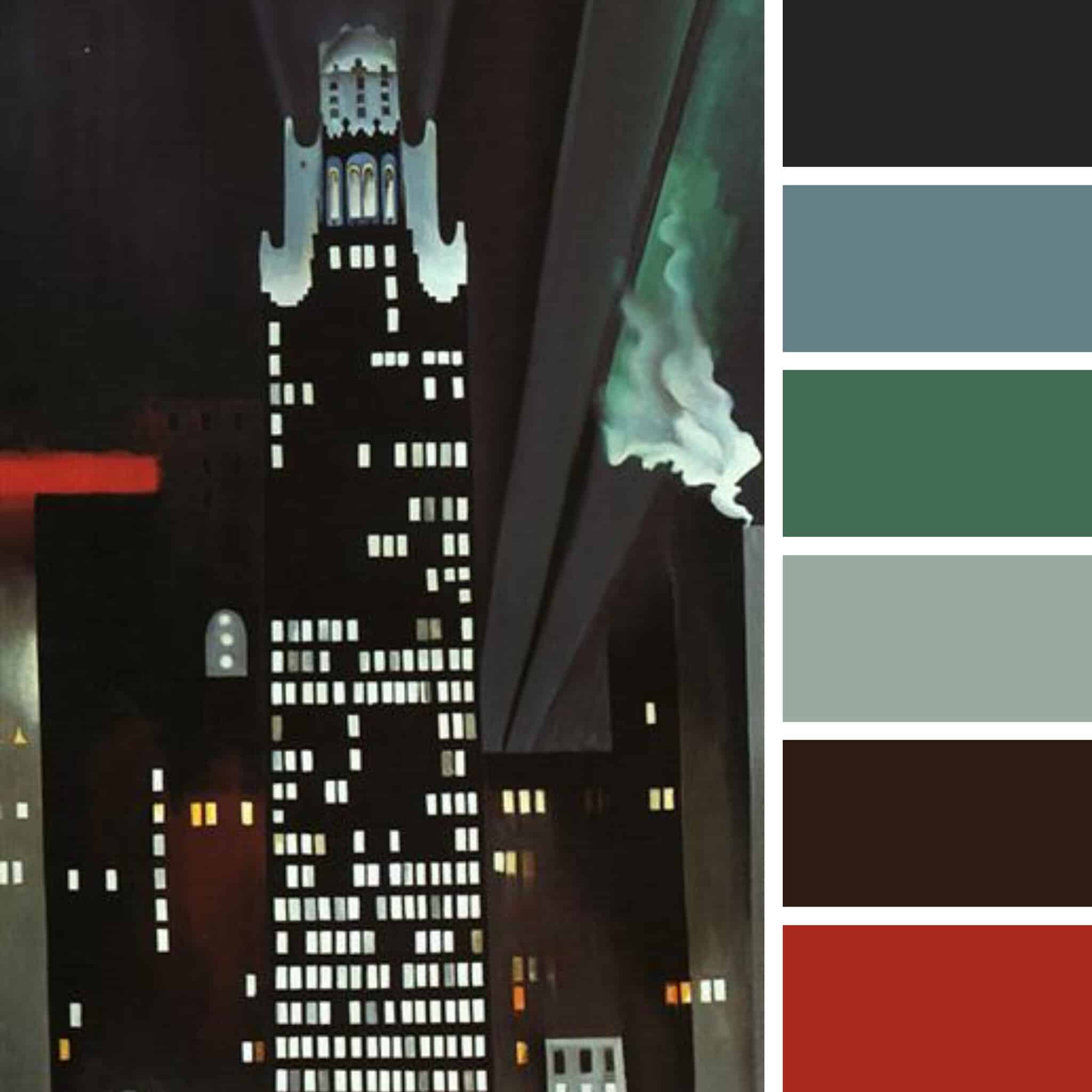 This month we are looking at colors I don’t usually use: blacks and reds! “Radiator Building – Night” is a painting that is primarily black and gray with pops of white and red. The yarn is created by using a tie-off resist for the whites and patches of red layered with the black.