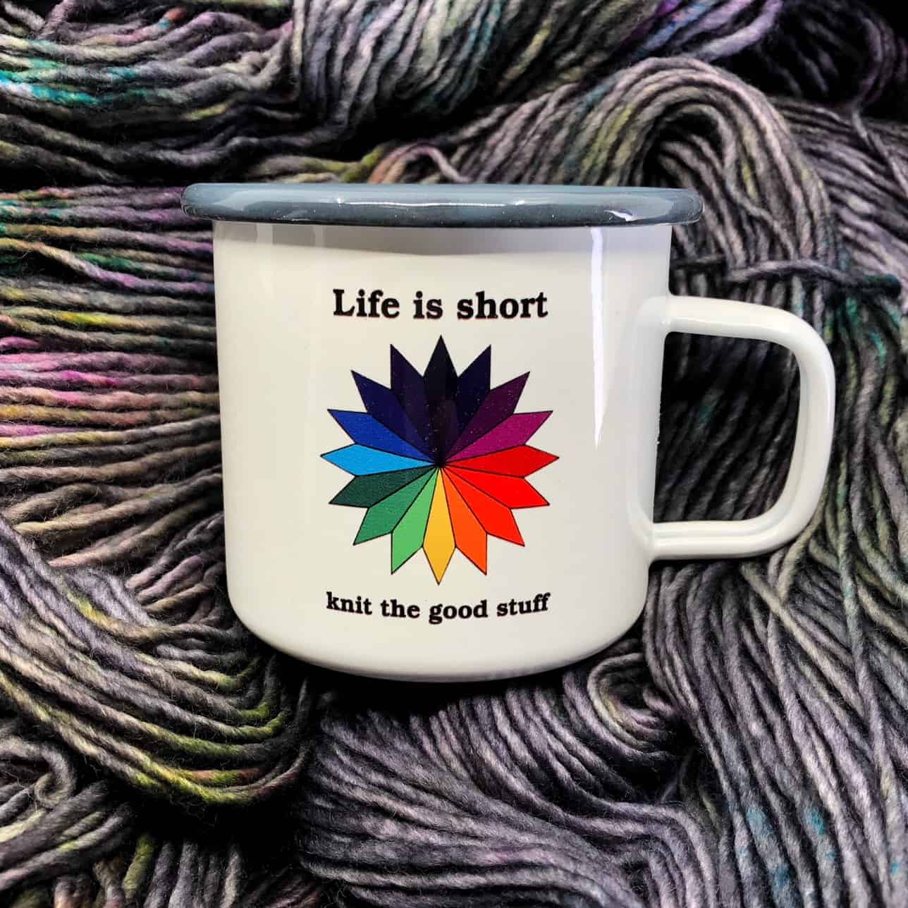 Also for MDSW, I have special 2018 MDSW-themed stitch markers sets from Katrinkles (while supplies last), and a new order of my popular camp mugs which include my personal mantra – Life is short, knit the good stuff.