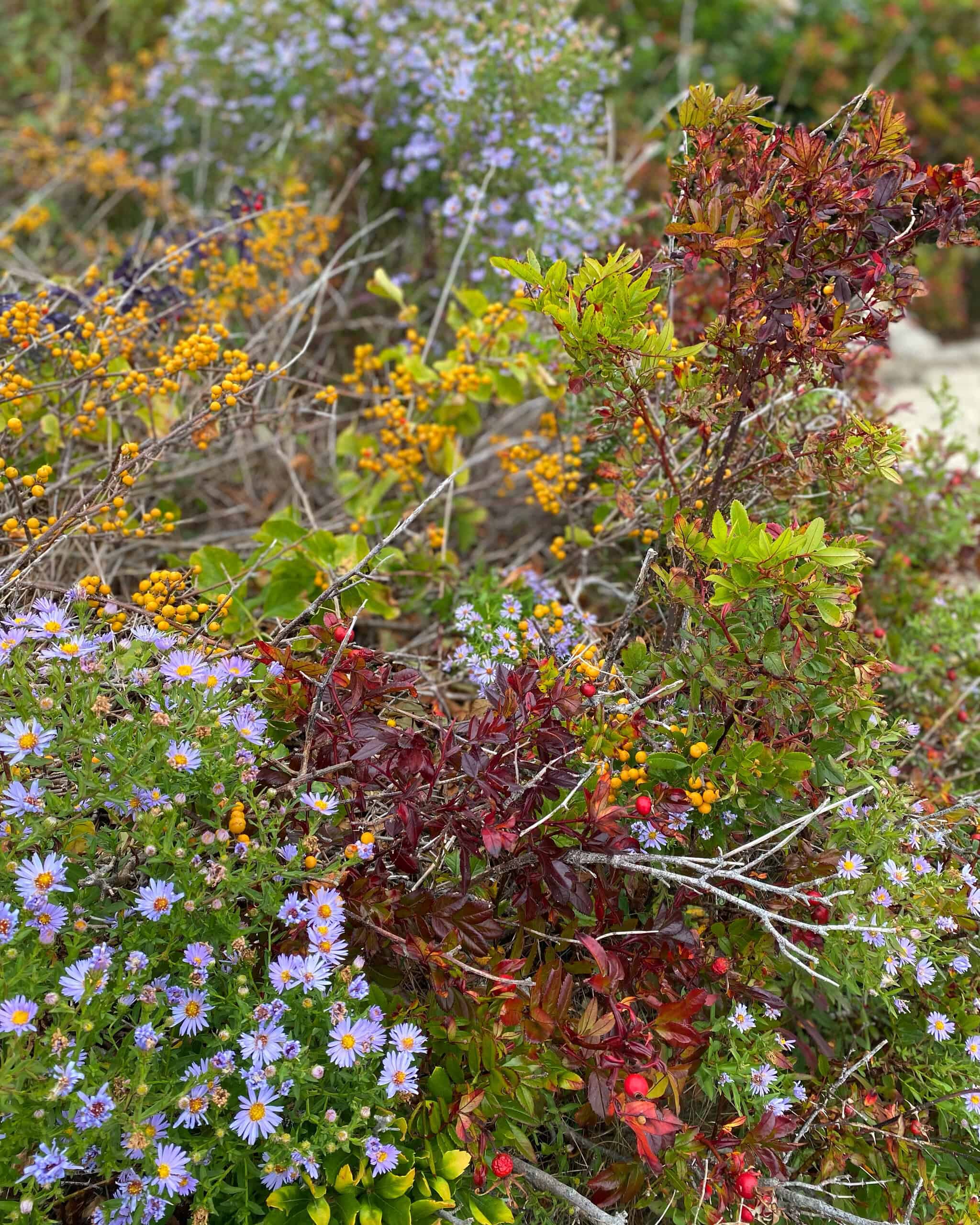 My inspiration for “Cape Elizabeth” came from a rocky hike at Fort Williams Park, where, dotted along a gray and blue landscape where stone met sea, an abundance of hearty wildflowers greeted us. The colors were remarkable and surprising against the overcast palette around us, and so, so reminiscent of Maine.