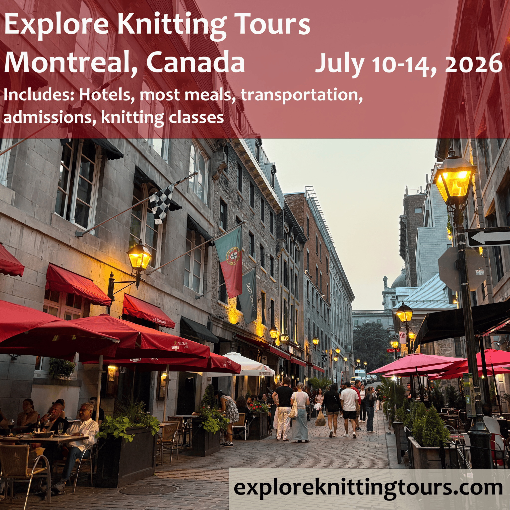 Join us July 10-14, 2026 on a knitting tour to explore old Montreal, with sightseeing, shopping, knitting, and more. Montreal is the largest city in the Quebec province, with its cobblestone streets in Old Montreal and historic architecture. Known for amazing food and culture, Montreal is like stepping into France without crossing the Atlantic. We will visit the iconic Notre Dame Basilica, take in some art at the Montreal Museum of Fine Arts, explore a culinary adventure by taking a Montreal food walking tour, and visit a farmer’s market for a French shopping experience. Montreal has incredible yarn stores that we will visit, including La Maison Tricotee and Les Garçons Boutique. Knitting classes will consist of creating knitwear inspired by our travels, all levels of knitting can be accommodated. Hotel (4 nights), admissions, transportation in the city, knitting classes, 7 meals included. Come explore Montreal with us!