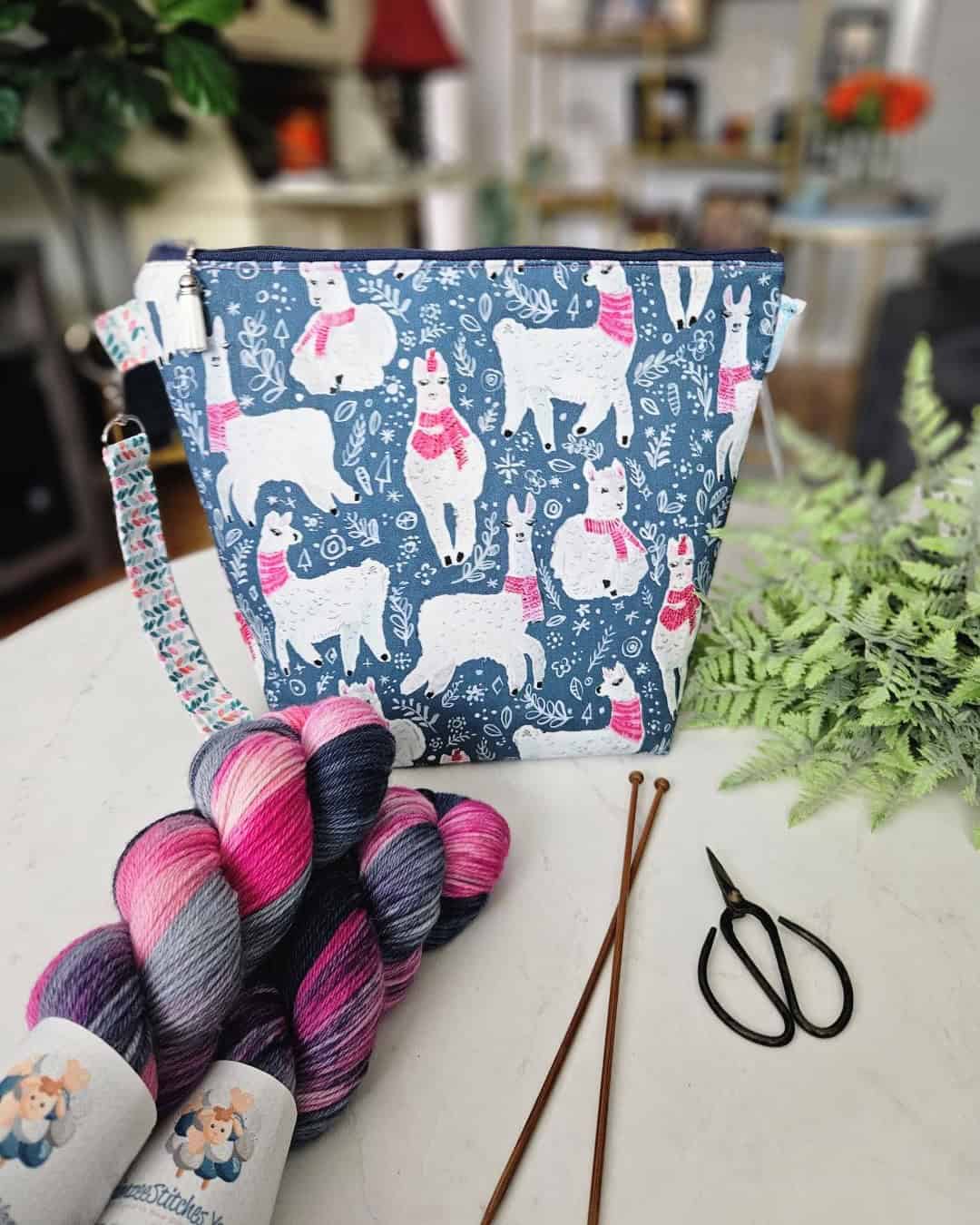 Lately, it’s been all about the llama drama around here. I discovered this gorgeous fabric months ago and have been saving it for just the right moment to turn it into a fresh batch of project bags. Winter Llama Drama features the sweetest llamas bundled up in bright magenta scarves against a rich blue background.